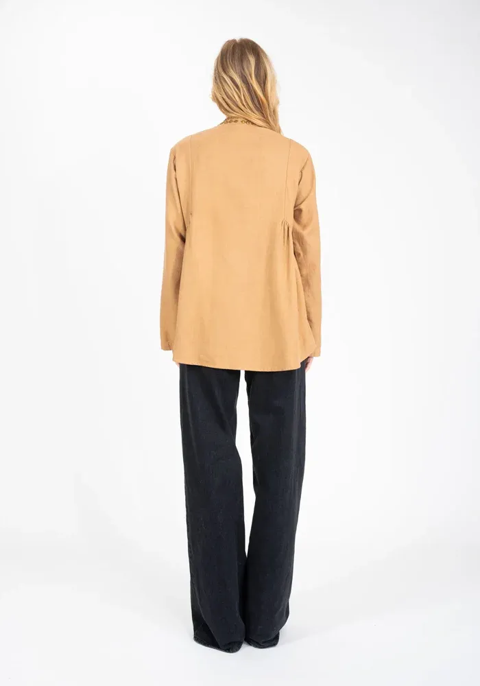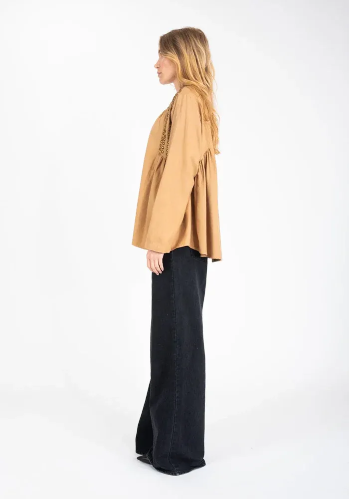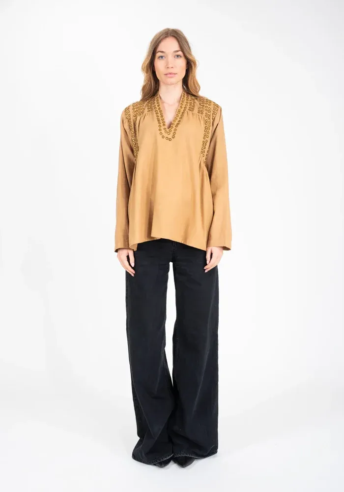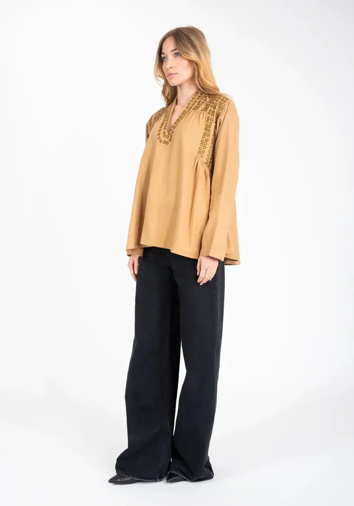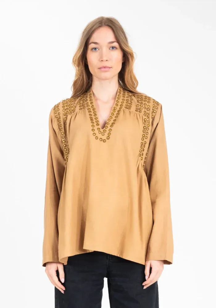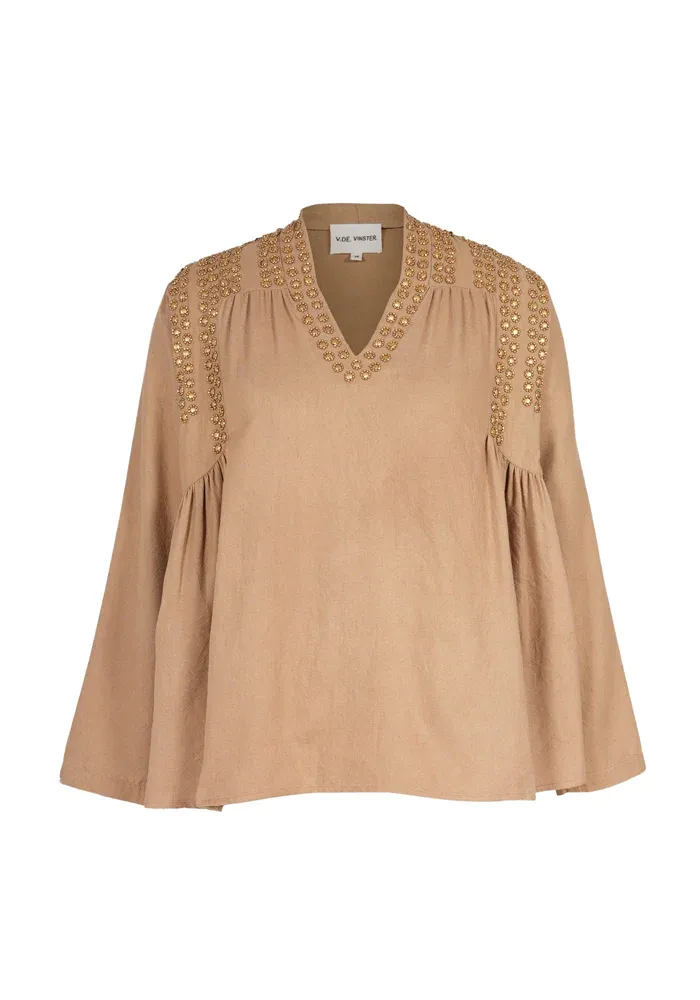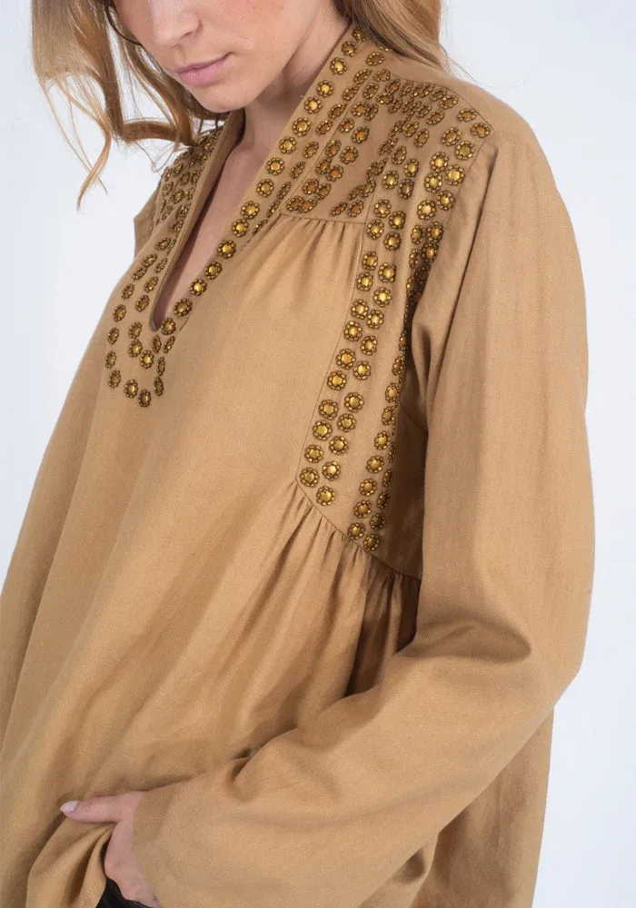 Blouse Bling à manches longues avec un col en V entouré de broderies fleuris dorées en perles.