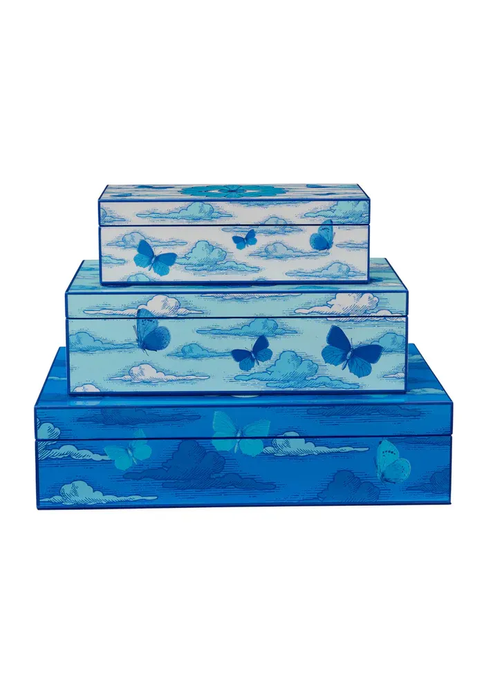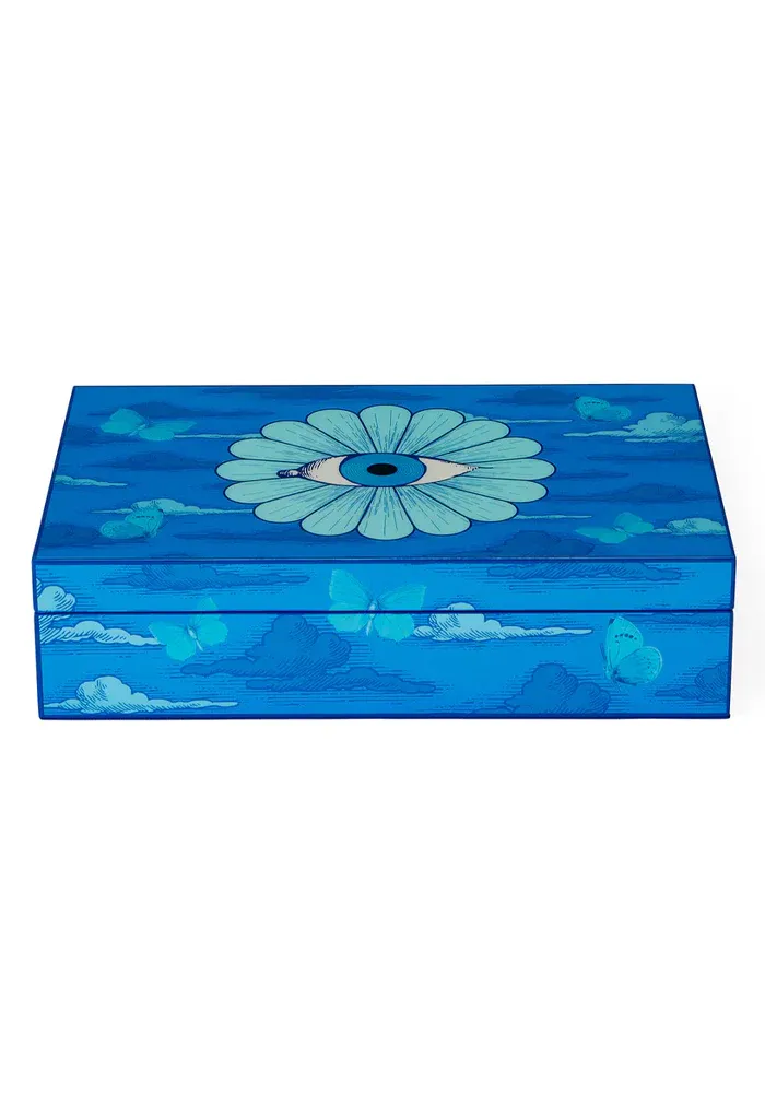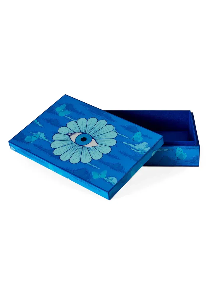 Boite Druggist Large laquée bleue avec des motifs oniriques du troisième oeil et des papillons.