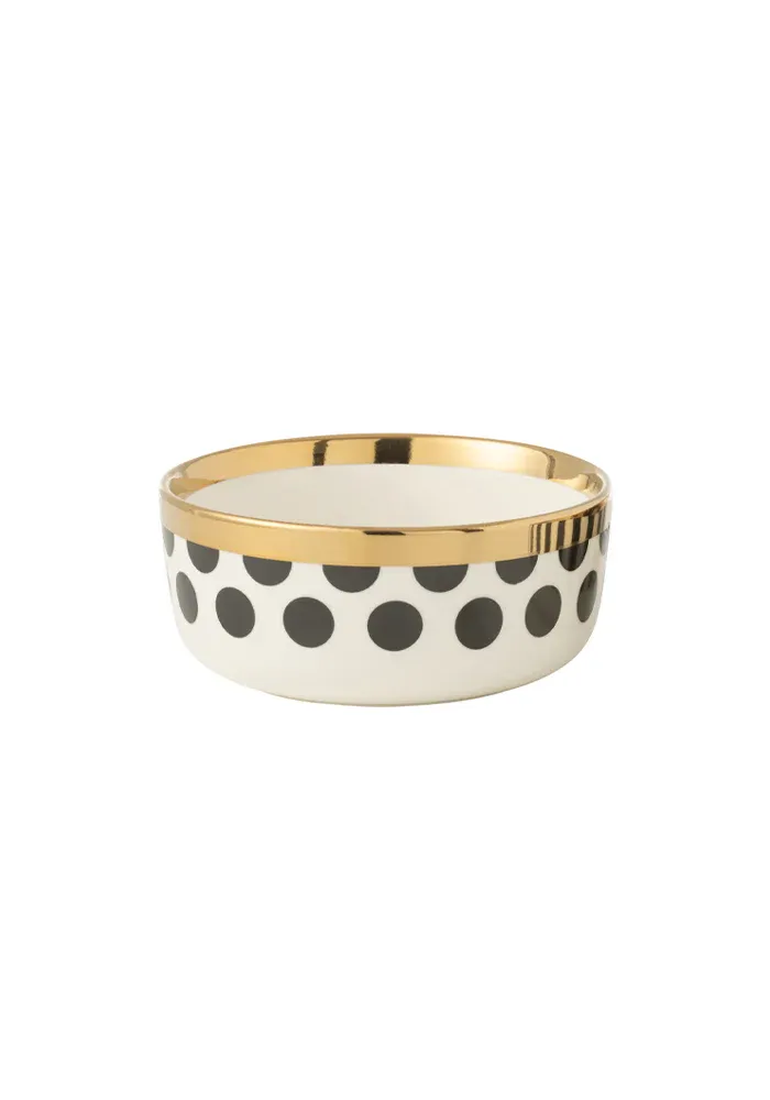 Bol en céramique avec des motifs pois noirs sur fond blanc avec le contour doré.