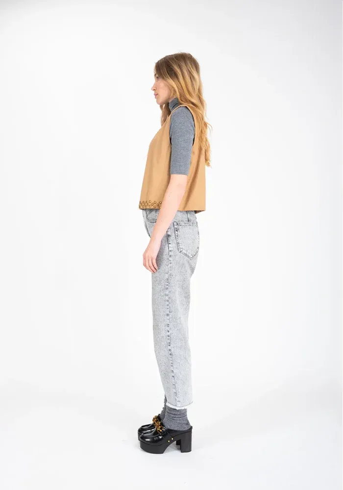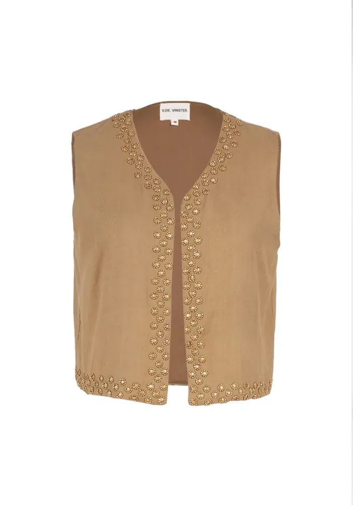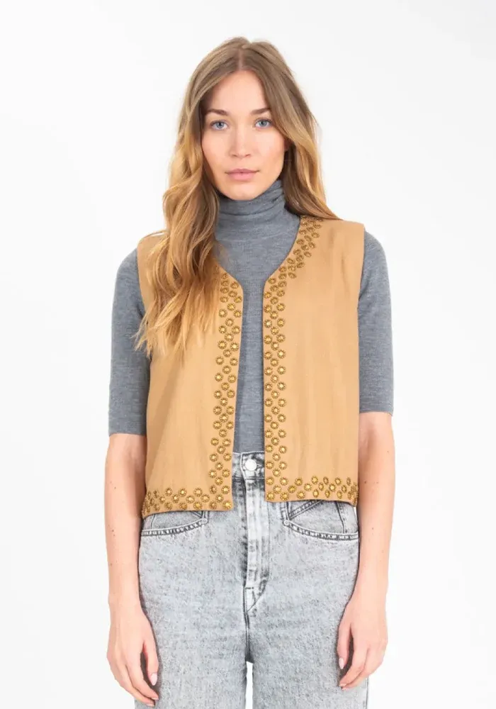 Boléro sans manches camel, en coton et laine mélangés, se pare de détails avec des petites sequins métalliques dorés.