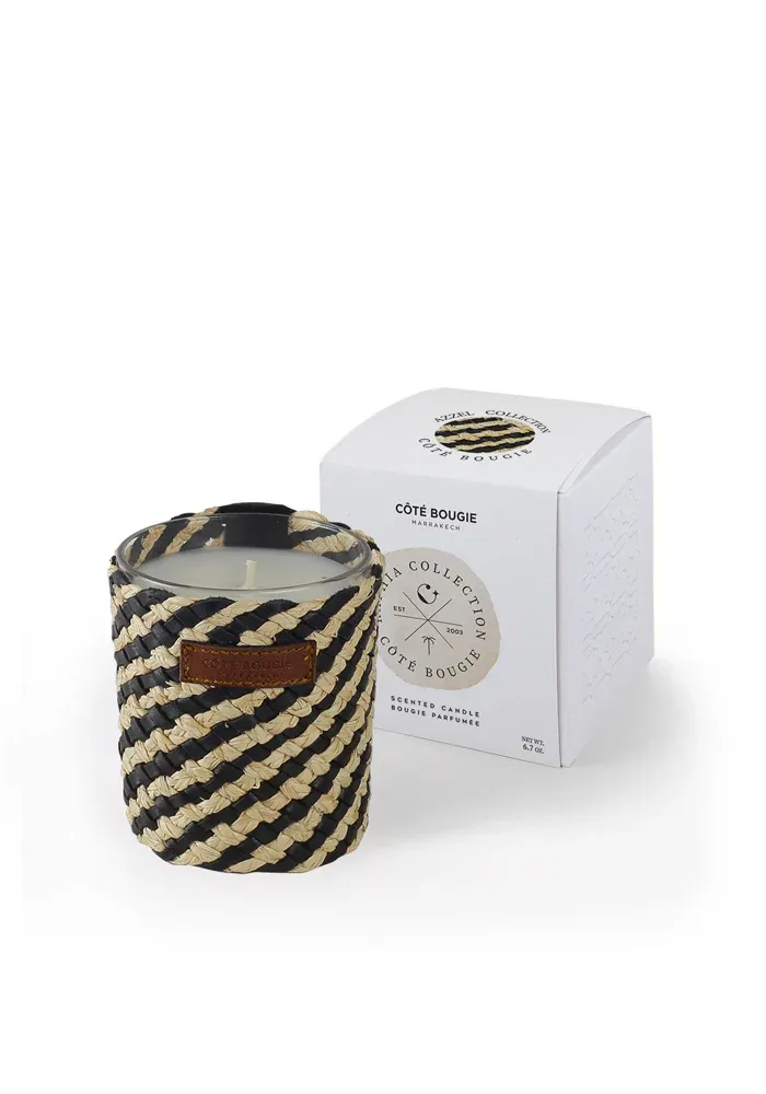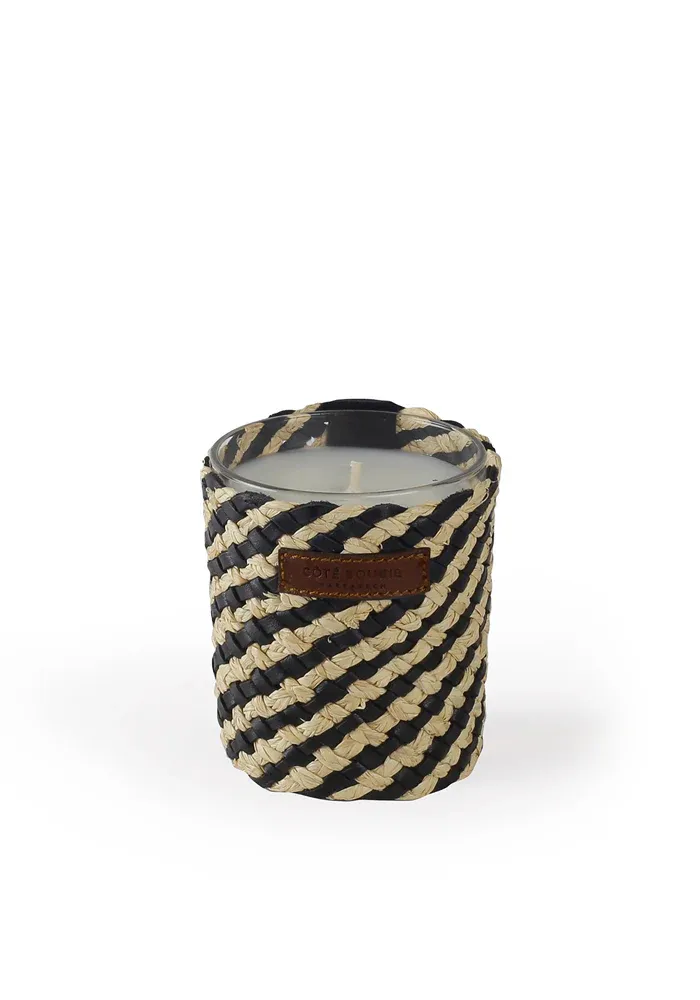 Bougie de la collection Azel, décorée de raphia et cuir tressé noir.