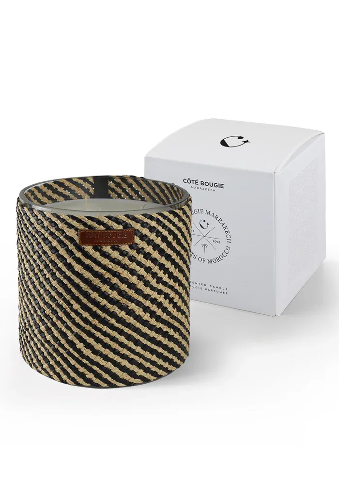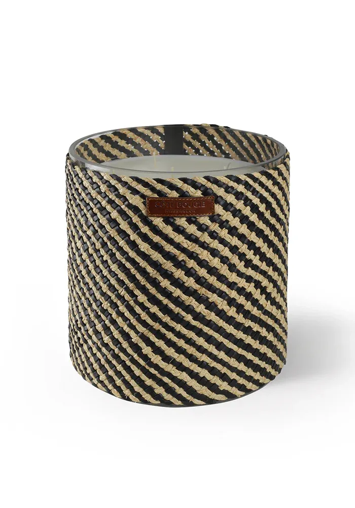 Bougie de la collection Azel, décorée de raphia et cuir tressé noir.