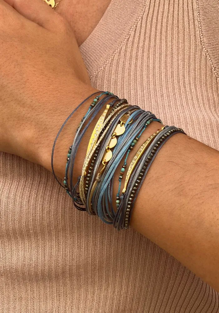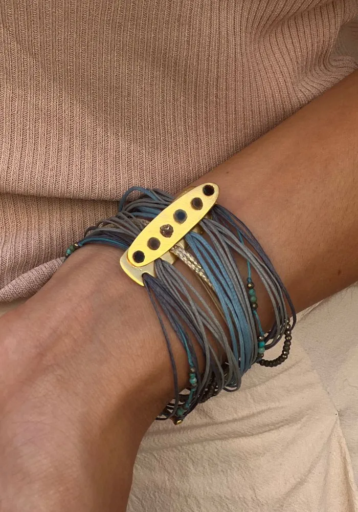 Bracelet multi rangs en fils de coton de cire bleu avec 4 rangs avec des pierres, 5 pastilles en vermeil et 2 barettes vermeil.
