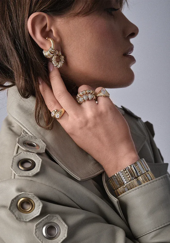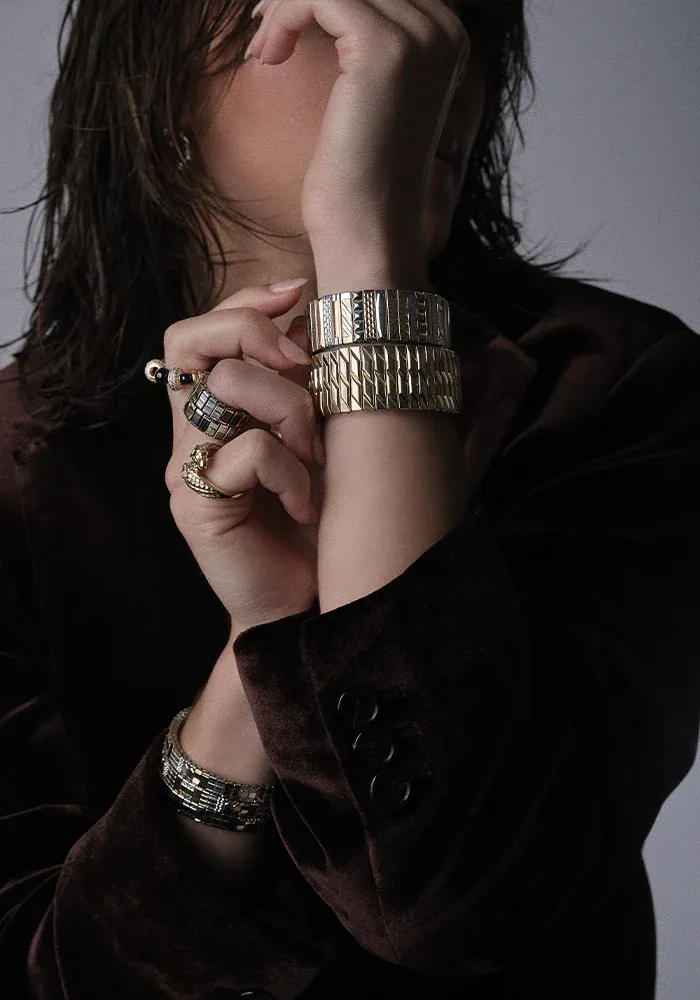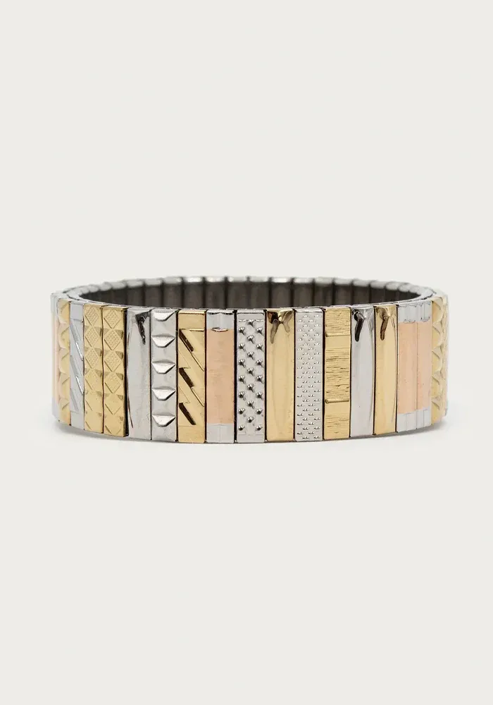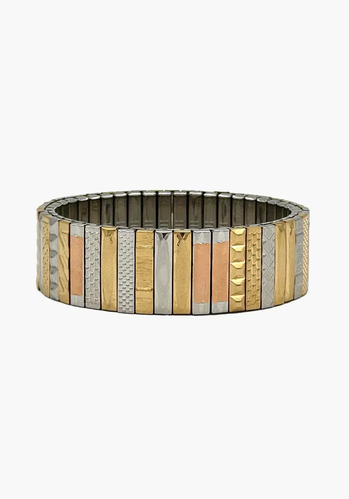 Bracelet Sig 18 fait de maillons de montres vintage recyclés avec des bandes dorées et argentées.