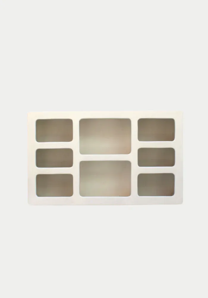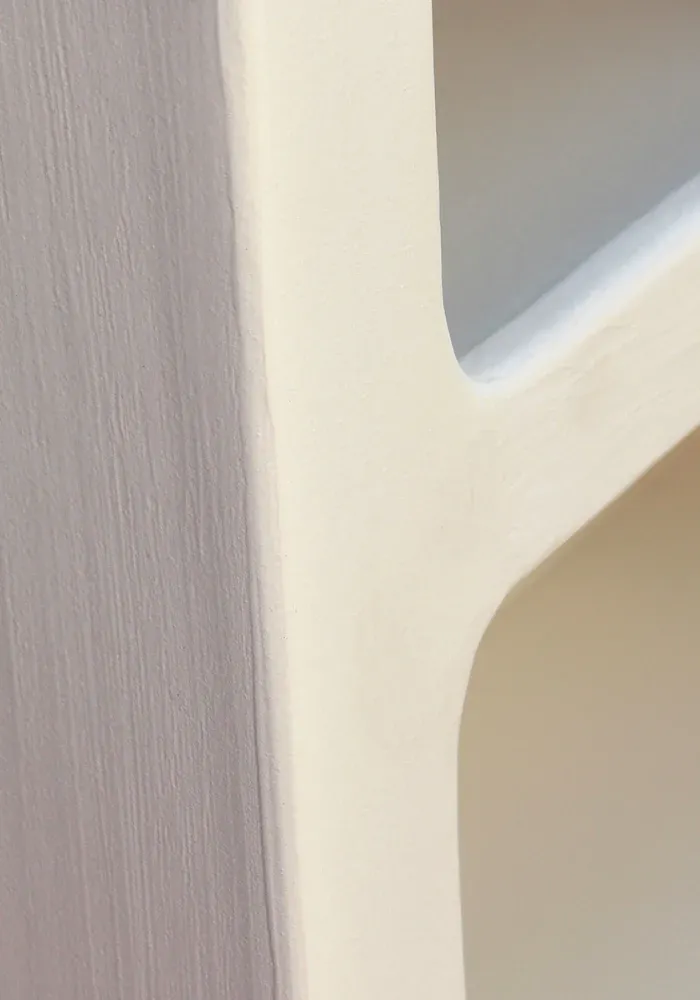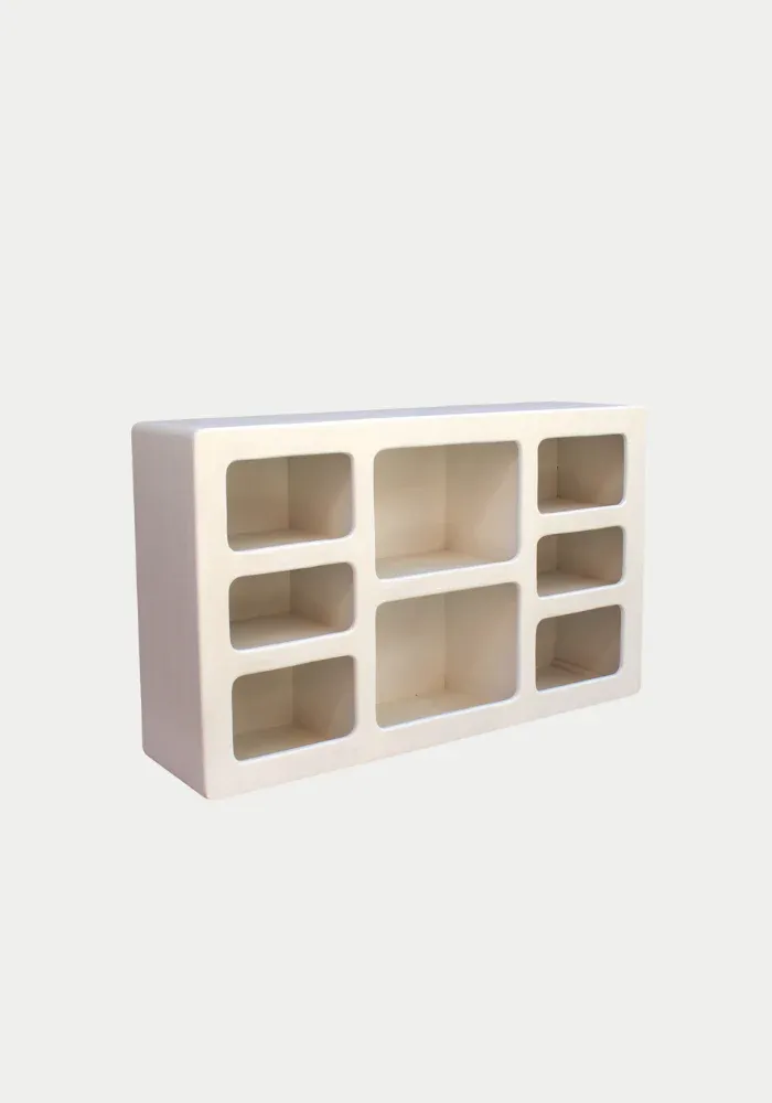 Buffet Mykonos en bois enduit à la chaux, de forme rectangulaire. Il possède 8 compartiments : 6 petits casiers rectangulaires et deux gros casiers carré au centre.
