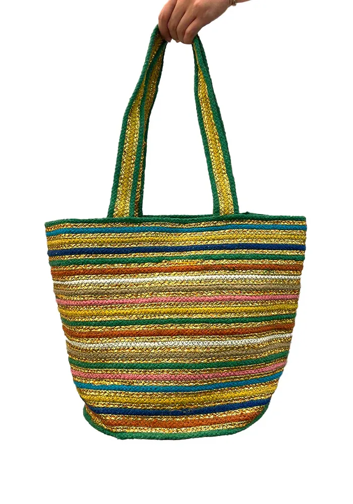 Soyez le premier à laisser votre avis sur “Cabas Rayé Doré, Multicolore Et Vert”