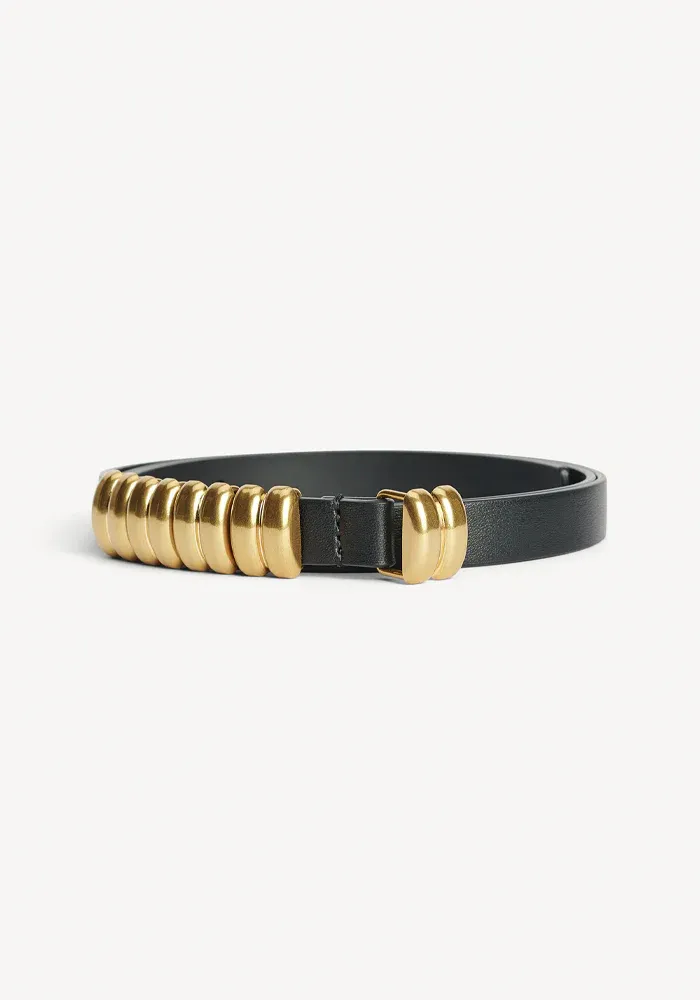Ceinture Ounlo en cuir avec un fermoir à arrondis dorés.