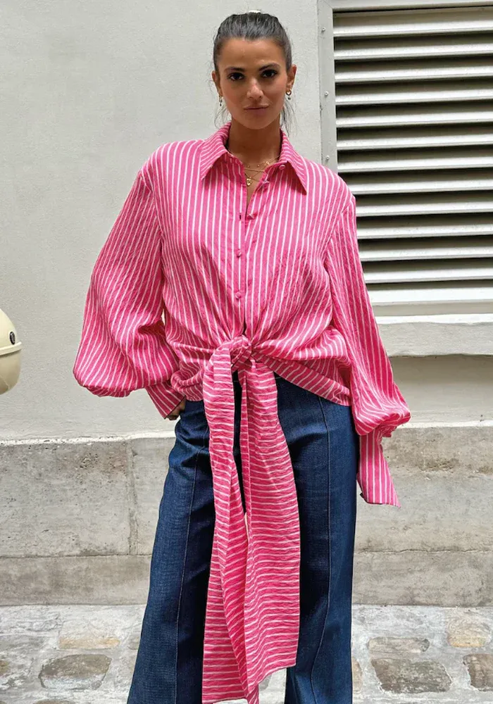 Chemise Bella avec des rayures verticales roses et blanches et un noeud sur le devant.