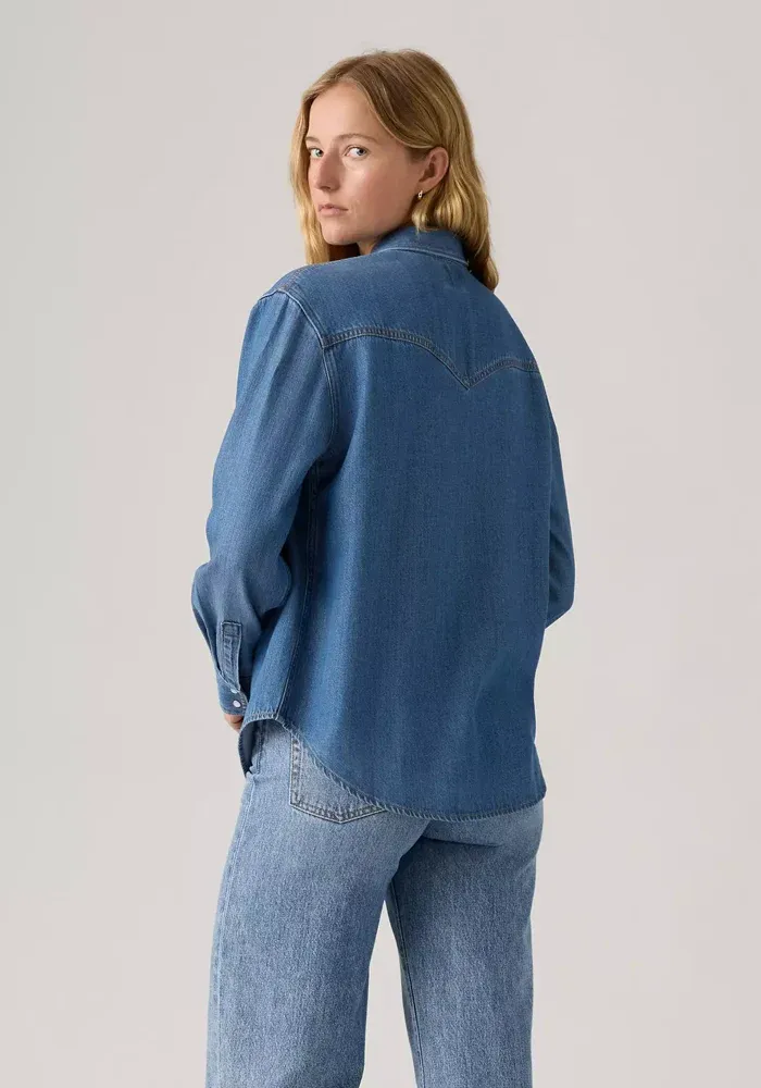 Chemise Teodora Western Going Steady Tipped en jean bleu avec deux poches à l’avant, un col en pointe et deux boutons pressions nacrés.