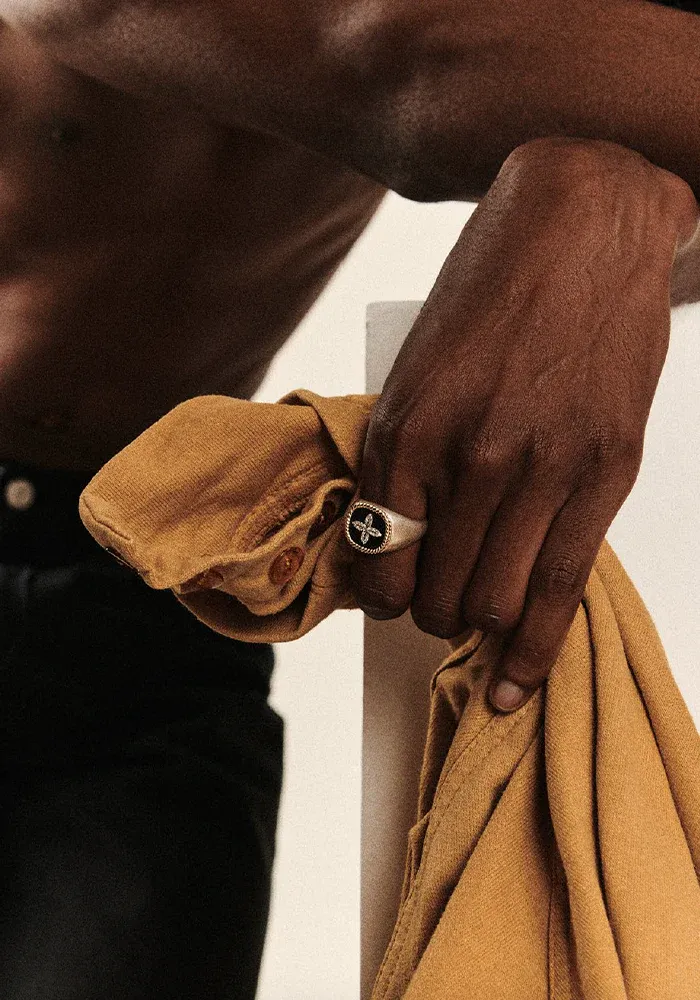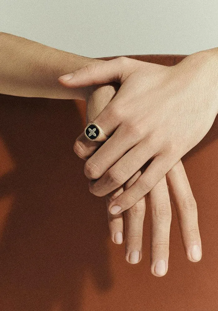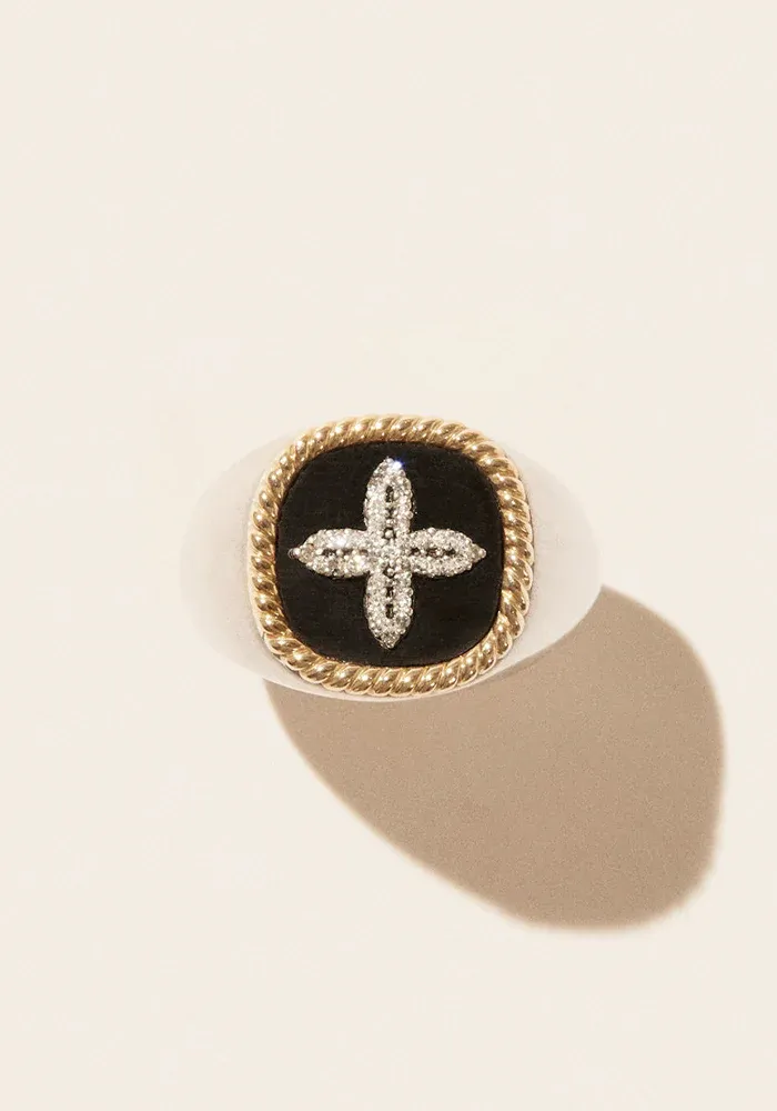 La chevalière Bowie pour homme est en argent, en forme carre en or jaune avec une base bakélite noire et un croix en diamants au centre