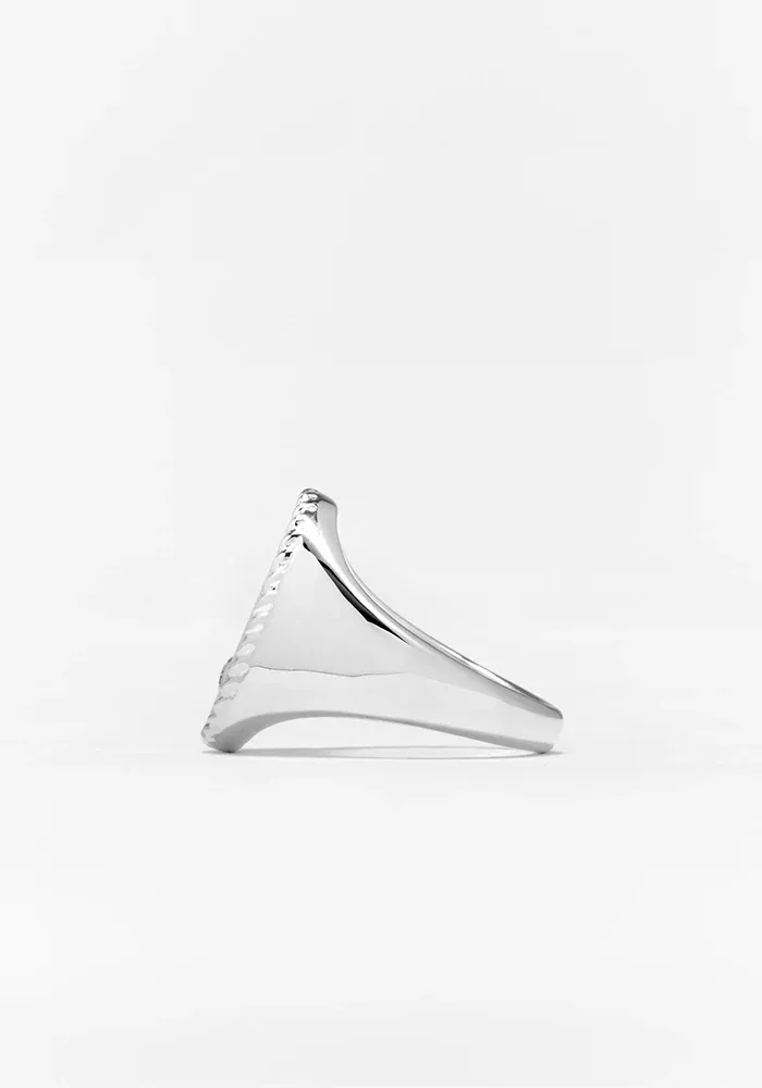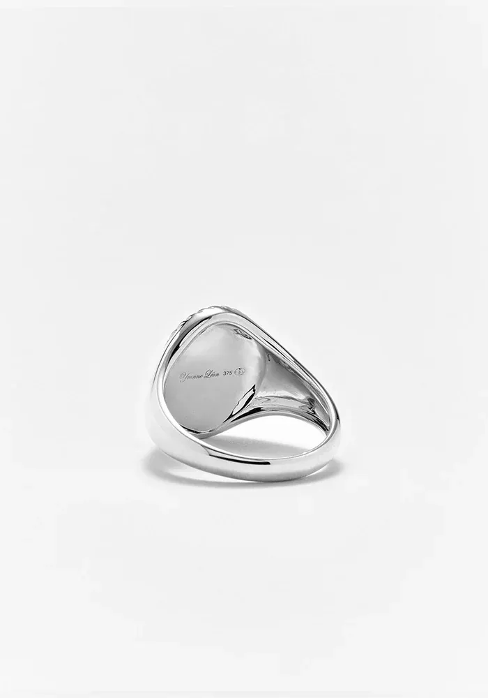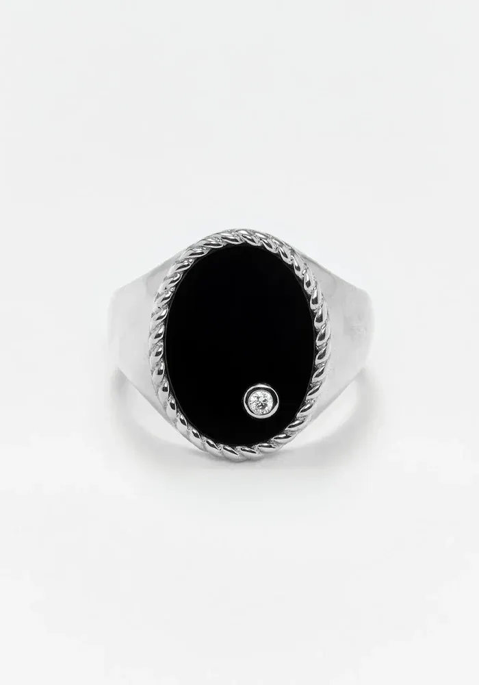 Bague chevalière en or blanc 9 carats ovale en onyx noir et diamant.