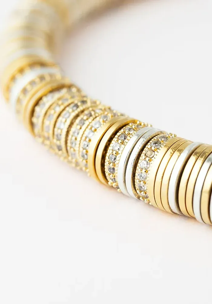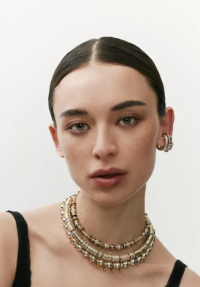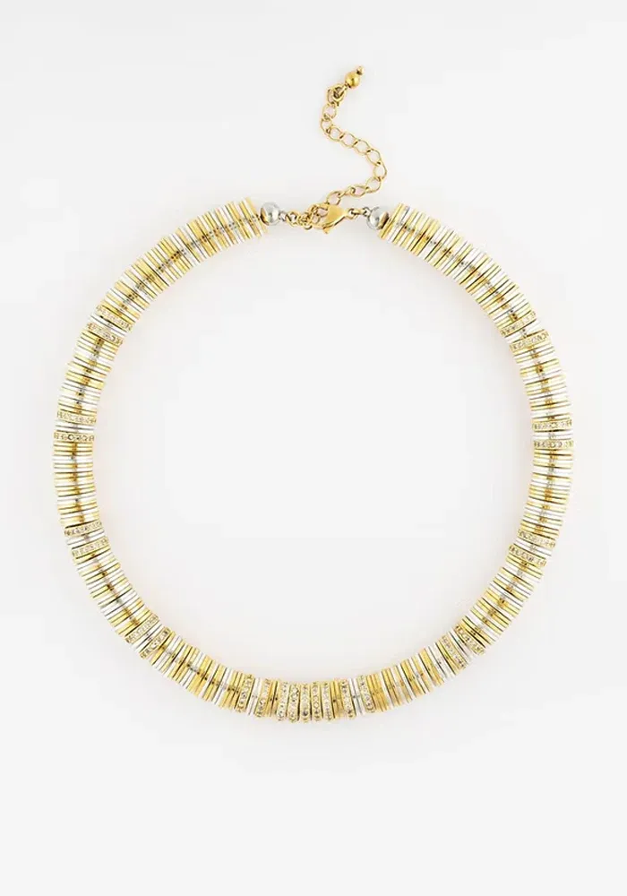 Collier Rondelles qui alterne des perles argentées et dorées.