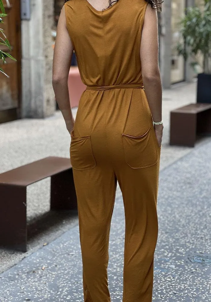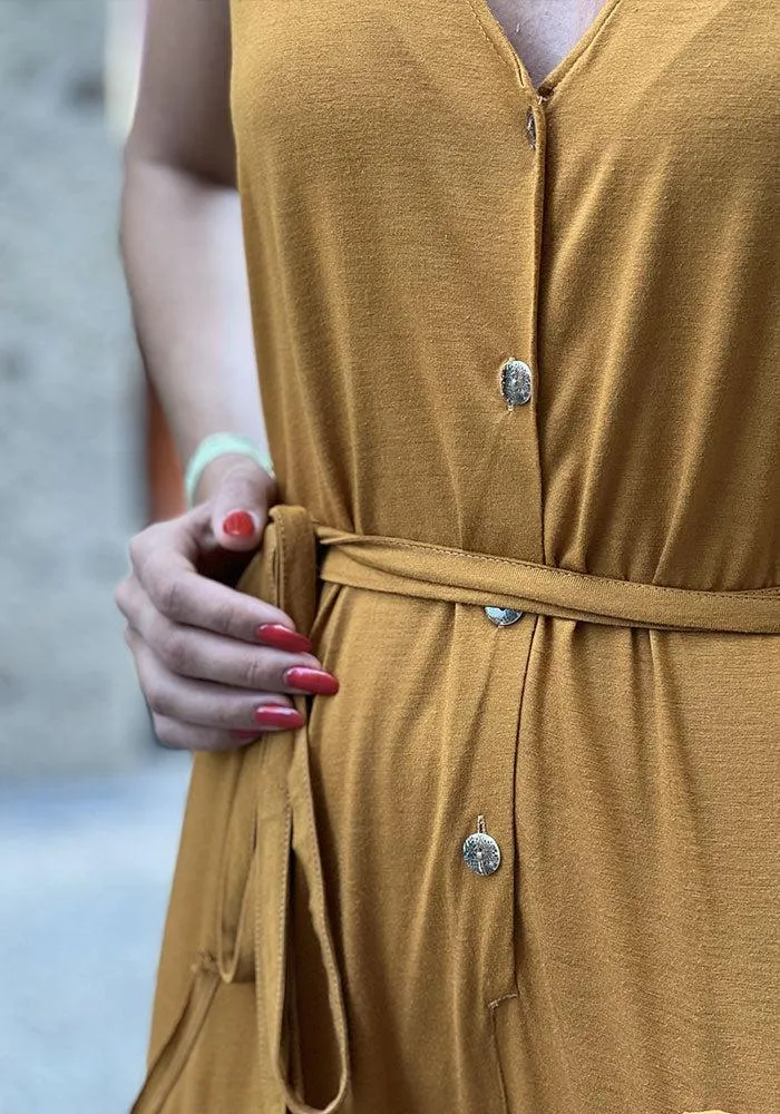 Combinaison pantalon Energie de couleur curry avec une ceinture à la taille. Cette combinaison dispose d’un décolleté en V plongeant, des poches, ainsi que des boutons à l’avant.