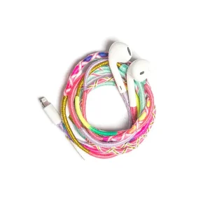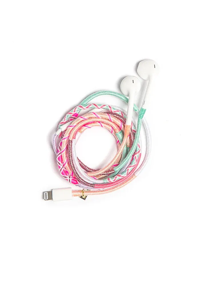Écouteurs Greta tressés à la main dans un tissu de couleurs pastel.