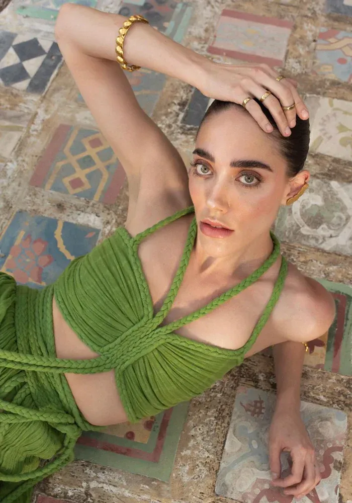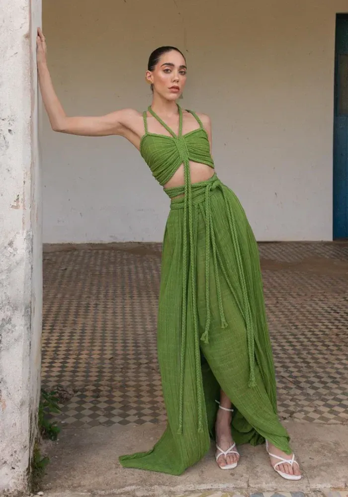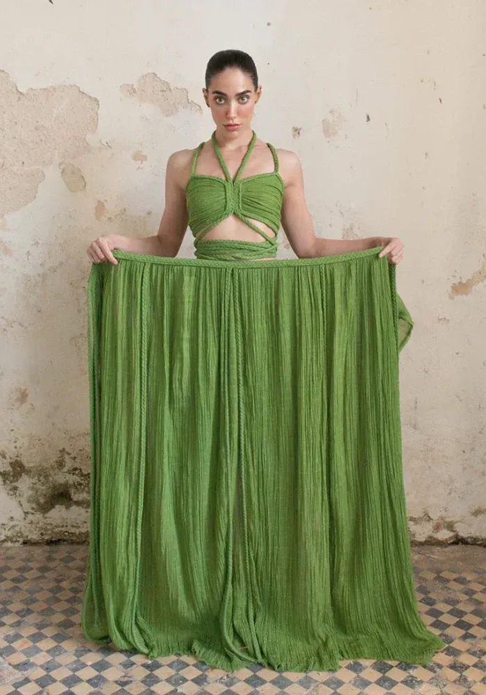 Ensemble Chiara composé d’une jupe longue avec les bords en tresse et un soutien-gorge bandeau avec des bretelles en tresse.
