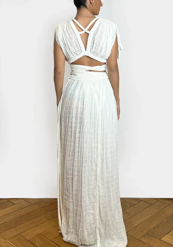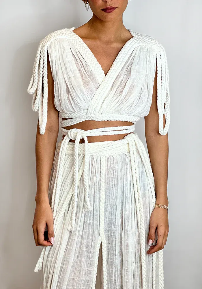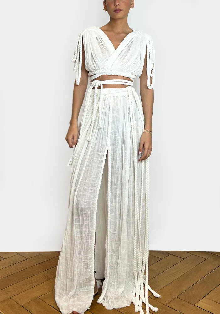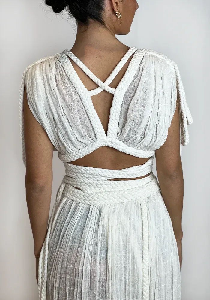 Ensemble Luna avec un haut tressé sur le devant et une jupe longue à fermer avec des tresses.