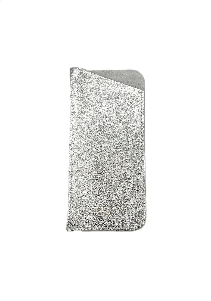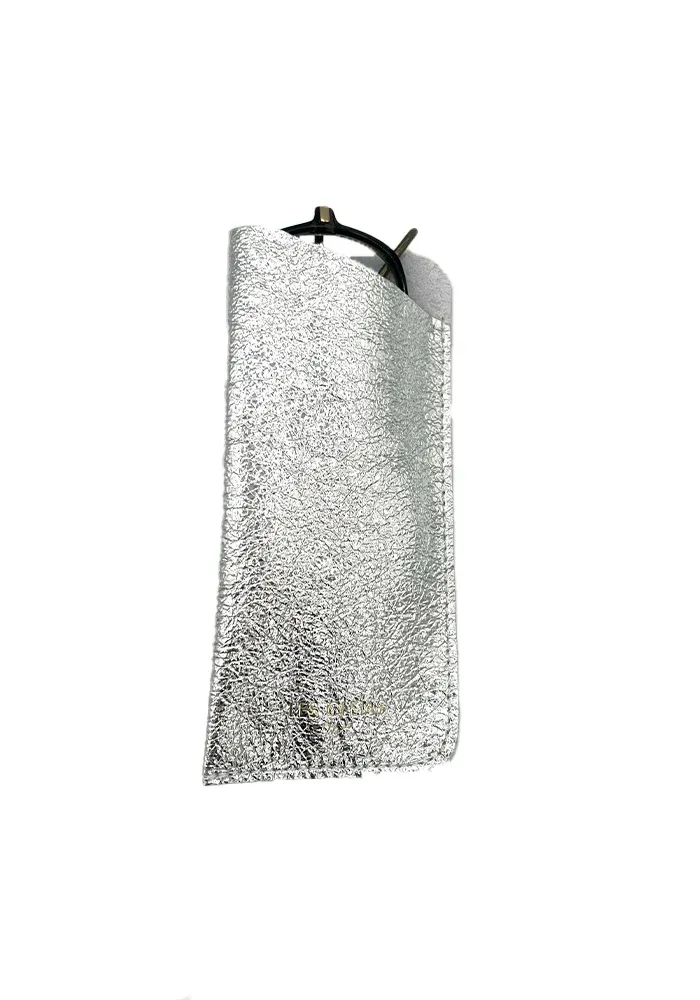 Étui à lunettes en cuir irisé argenté.