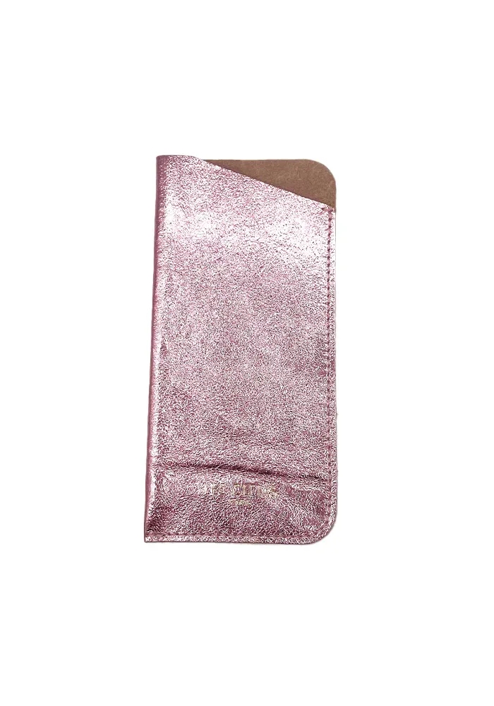 Étui à lunettes en cuir irisé rose.