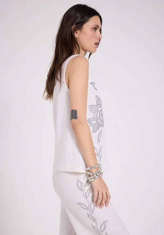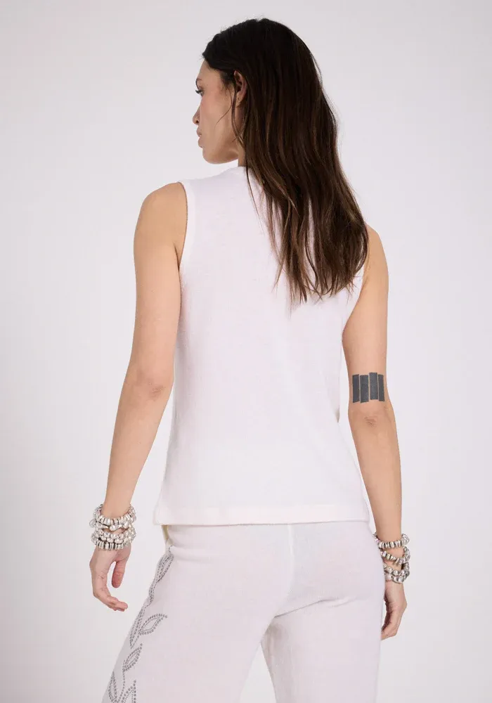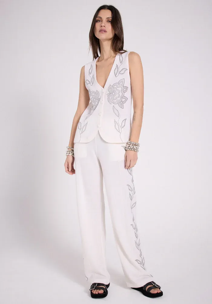 Gilet Iona en laine et cachemire, sans manches écru avec motifs cloutés argentés.