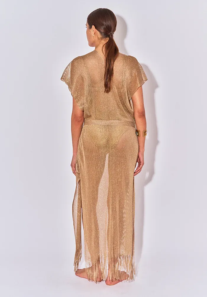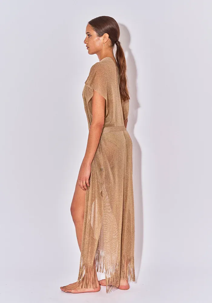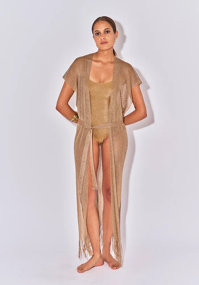 Gilet Lima long en lurex résille avec une ceinture large et des franges sur le bas.