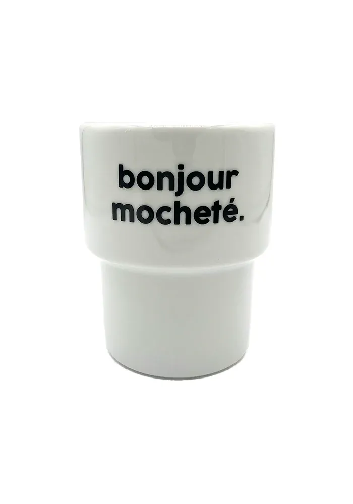 Gobelet en porcelaine blanche avec message « Bonjour Mocheté ».
