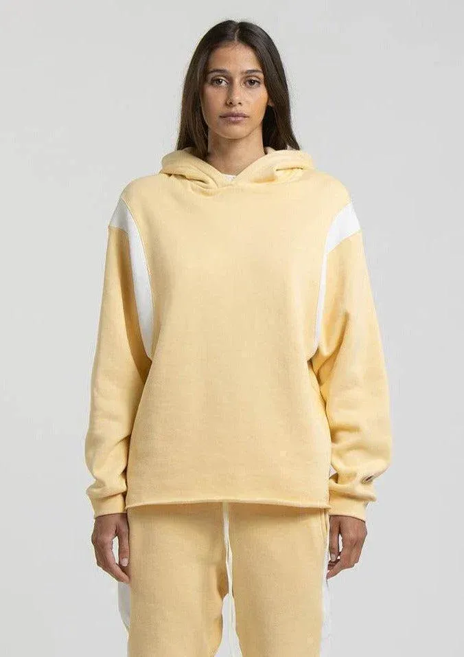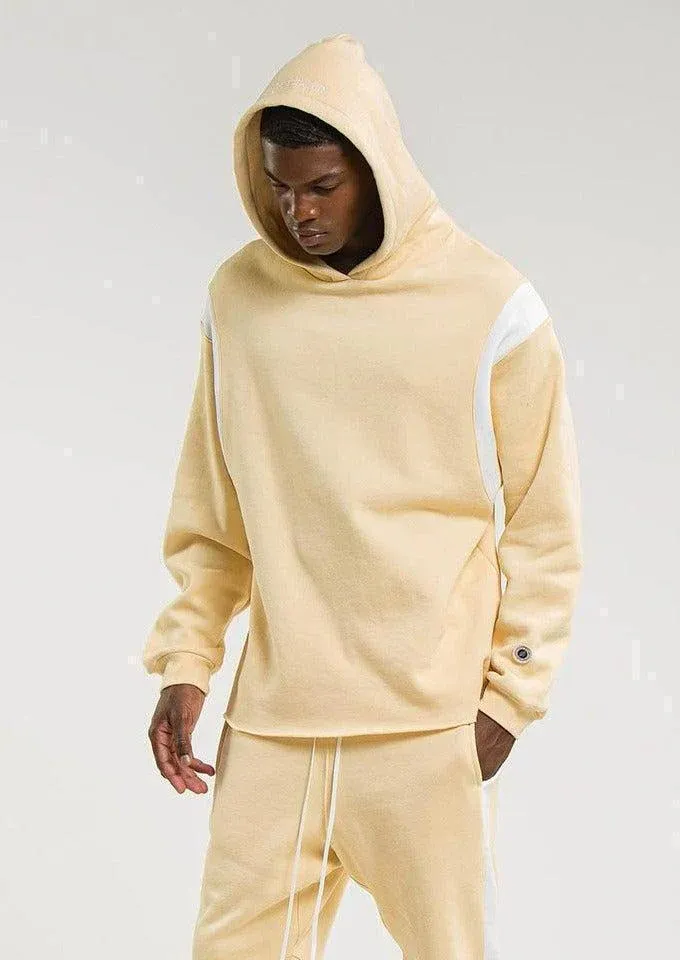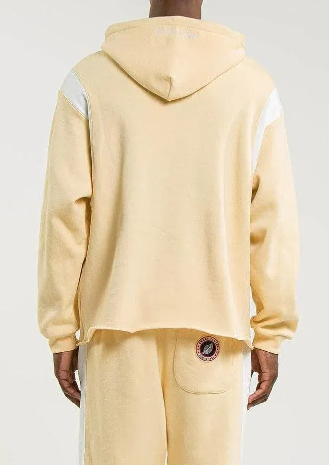 Hoodie Home run de couleur ocre avec une capuche et des bandes blanches sur les emmanchures.