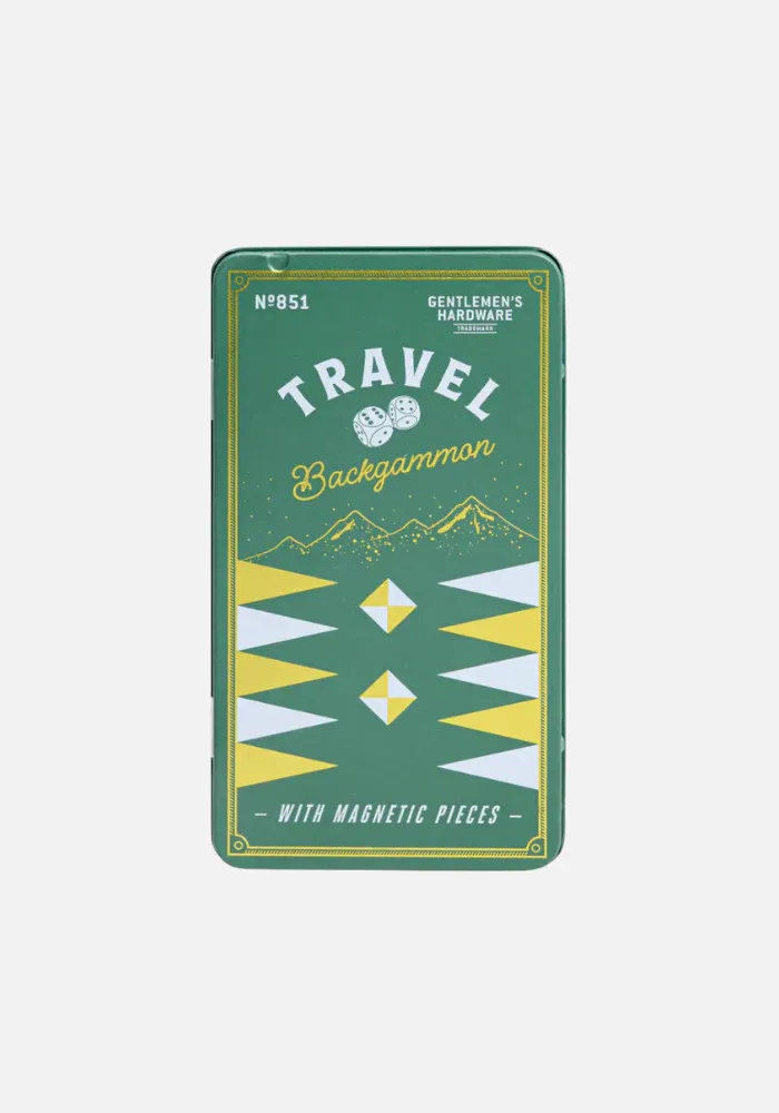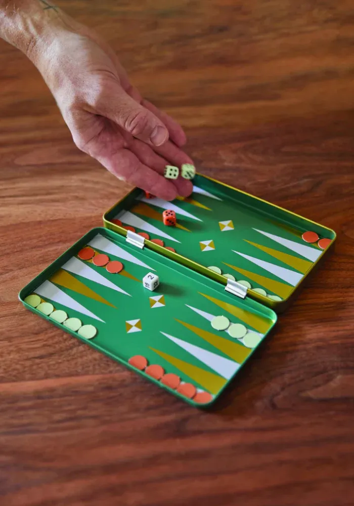 Jeu Backgammon en format voyage présenté dans une petite boite métallique verte magnétique pour un confort de jeu en toutes circonstances.
