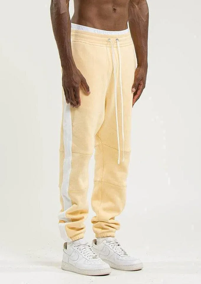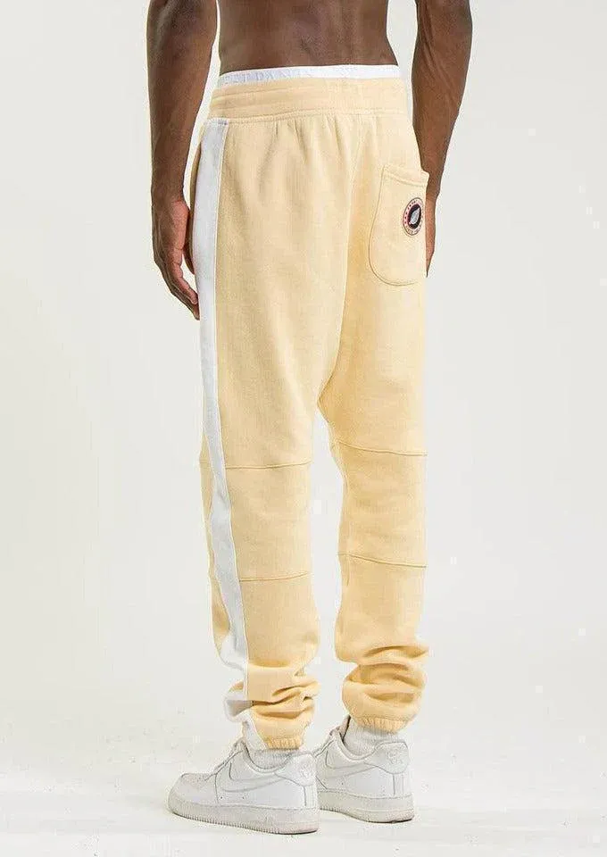 Jogging Home Run de couleur ocre, droit avec un élastique au bas et une bande blanche sur le côté.