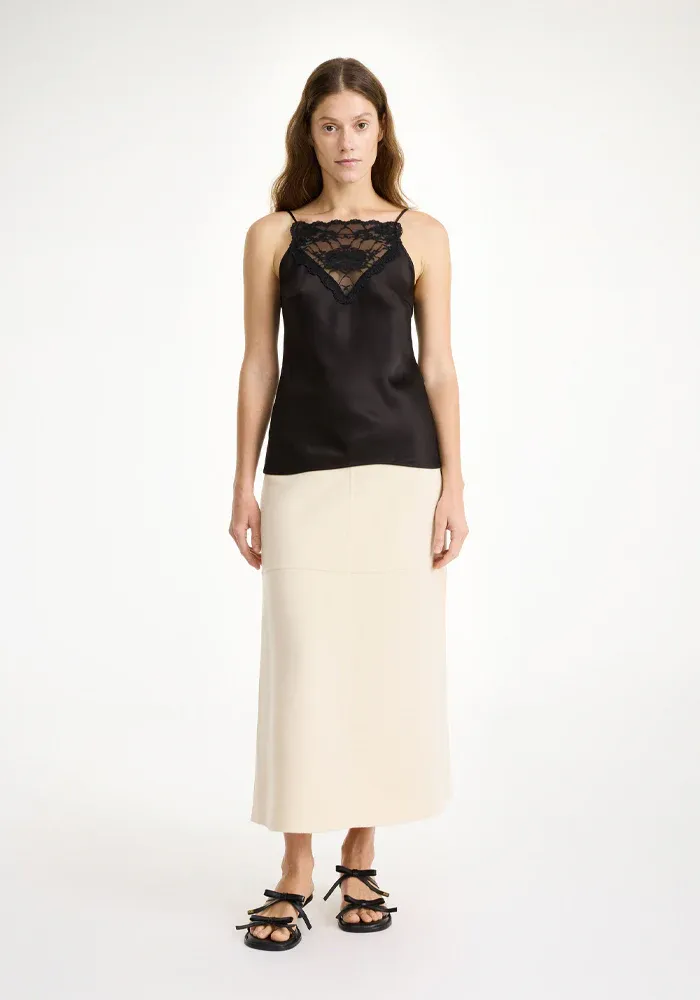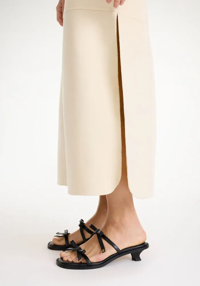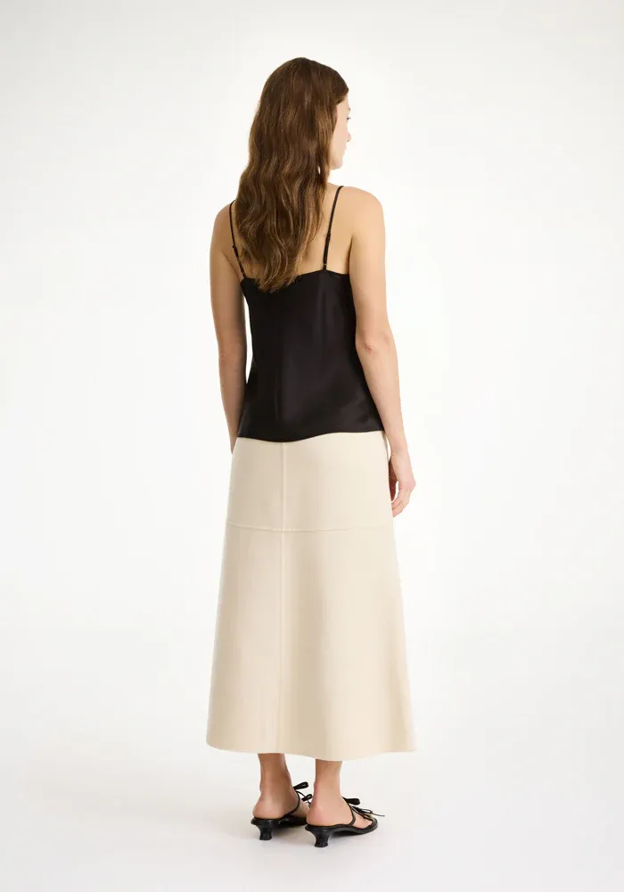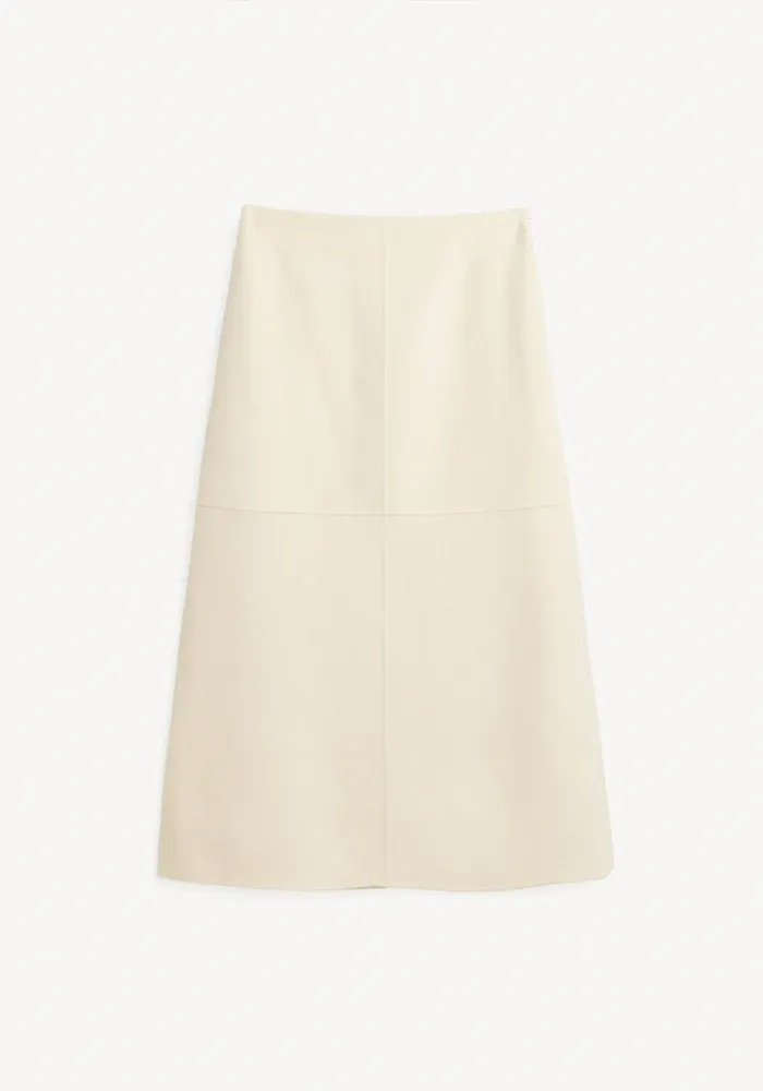 Jupe Angello beige en laine avec une coupe midi trapèze et une fente sur le côté.