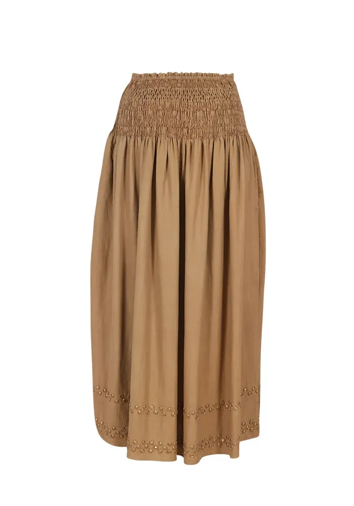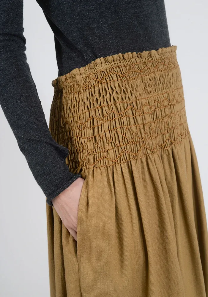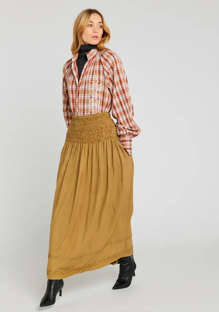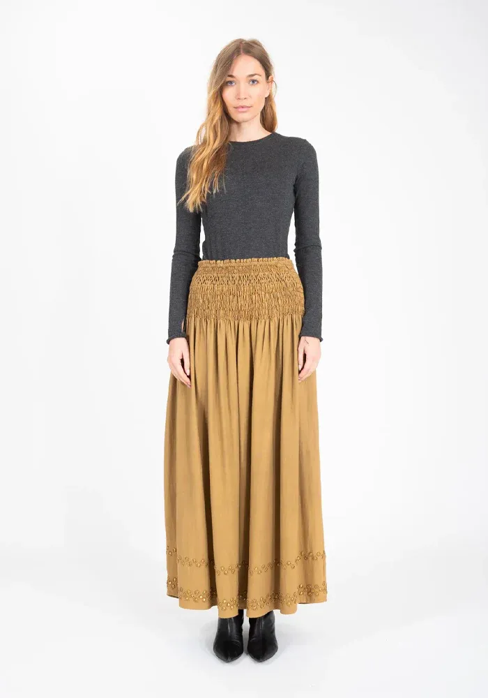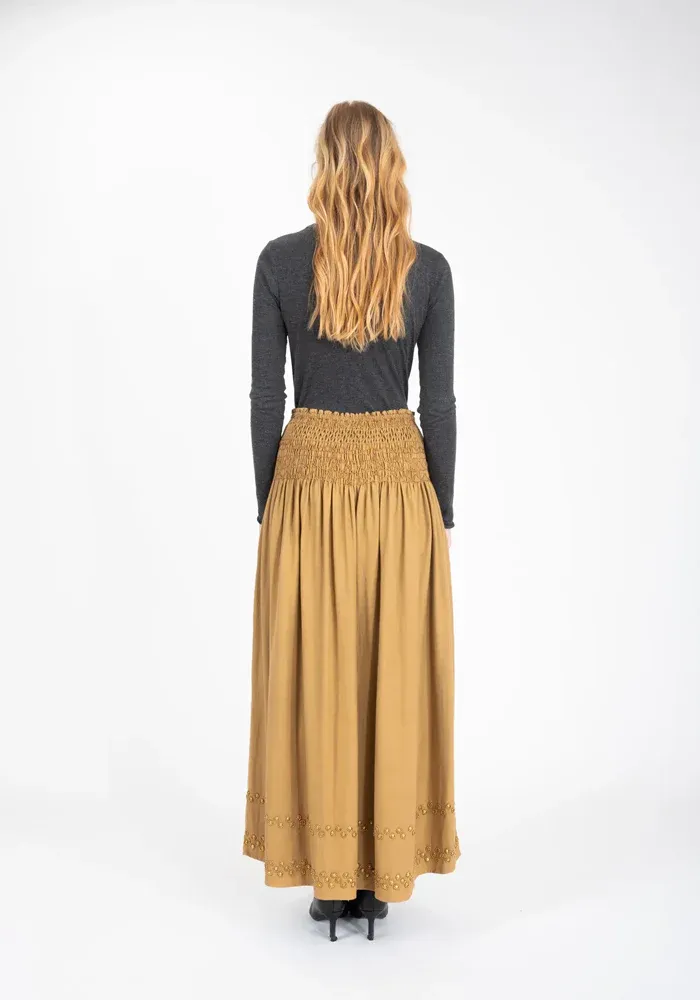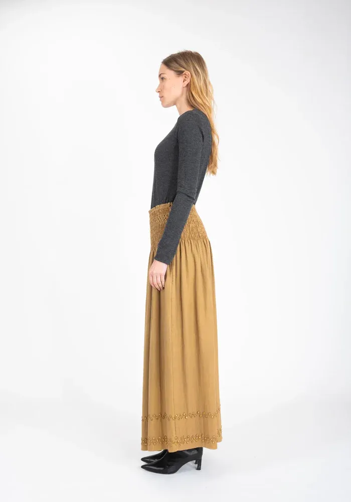 Jupe longue Bling dans un tissu camel, mélangeant coton et laine. Elle est entièrement smokée au niveau de la taille et deux lignes de sequins métalliques sont présentes en bas de la jupe.