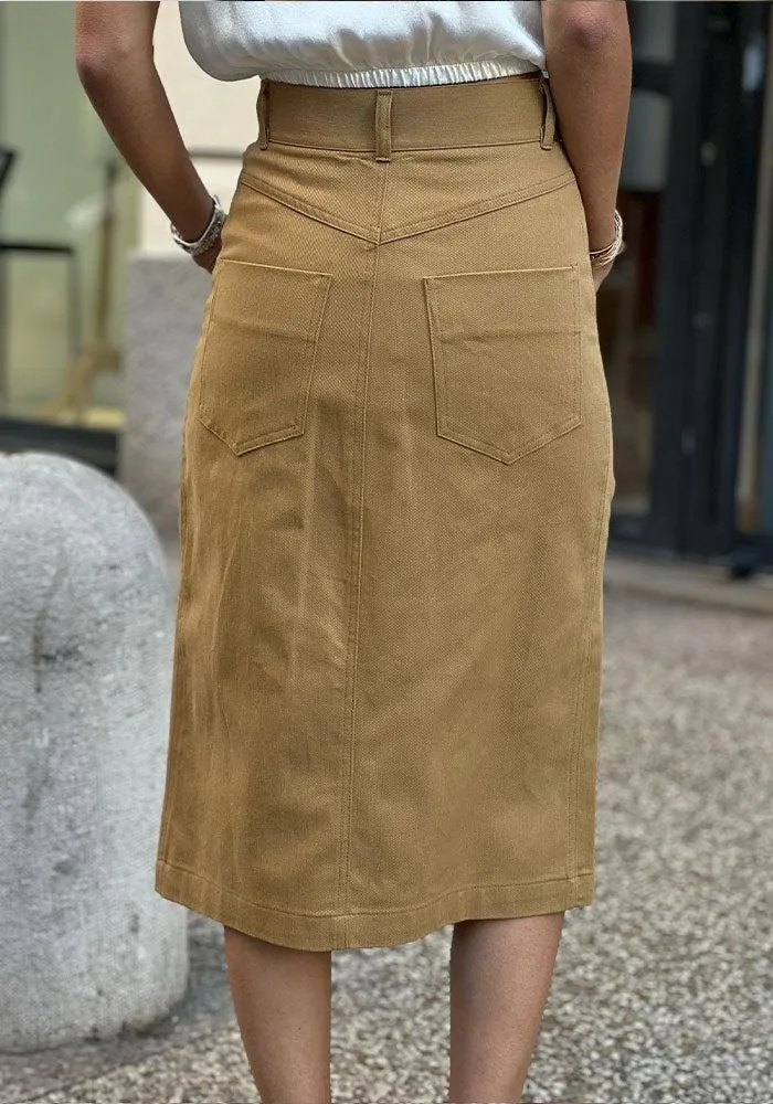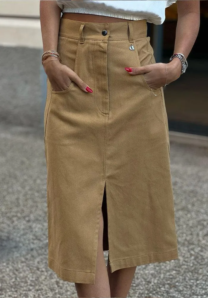 Jupe camel en jean fin avec une fente avant.