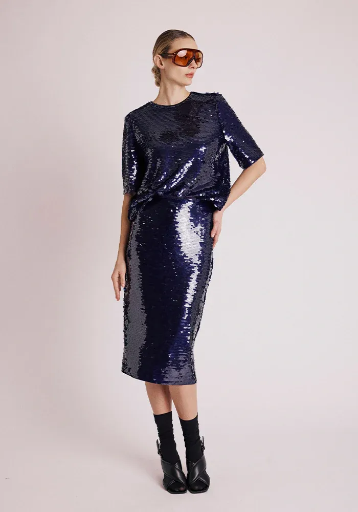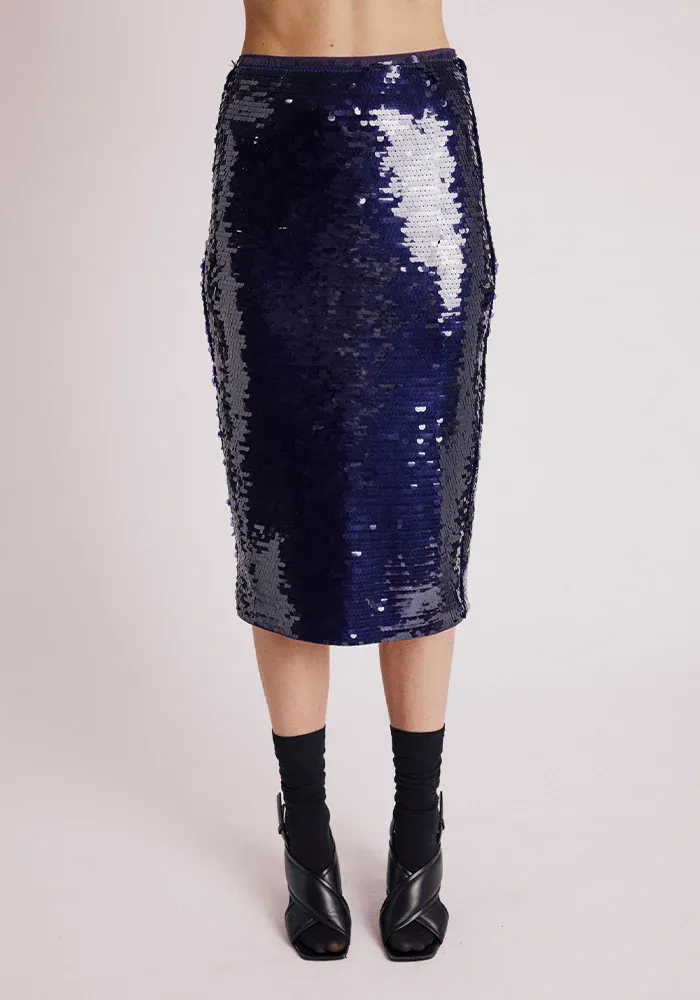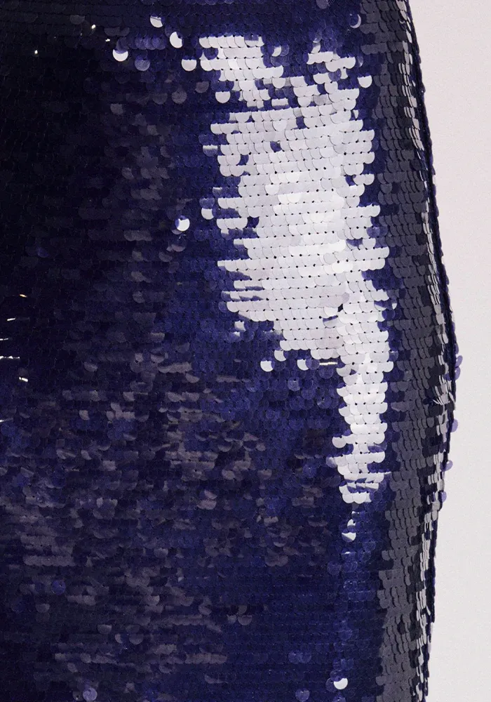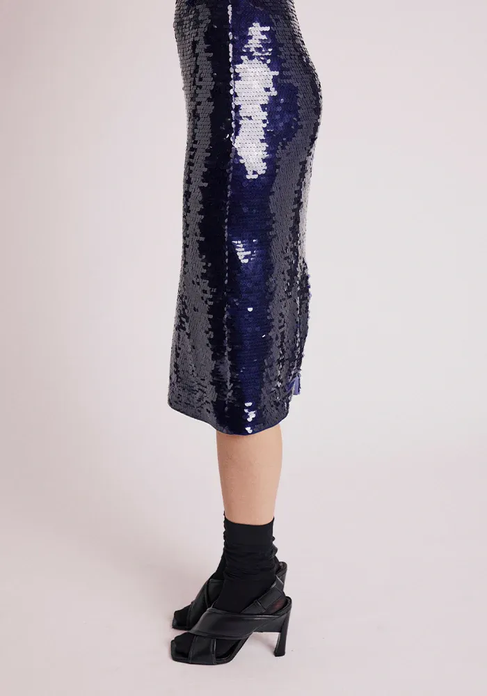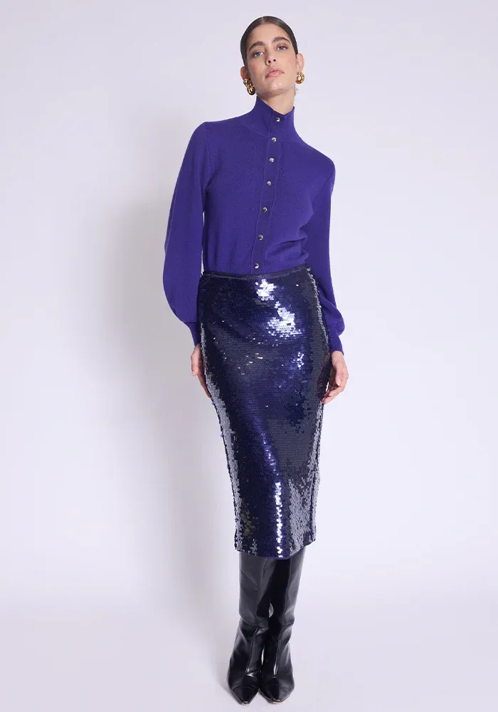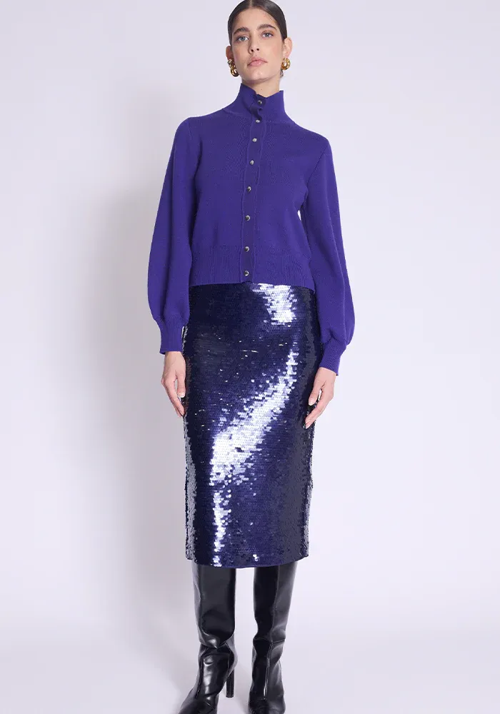 Jupe Jamy coupe midi droite, violette et recouverte de sequins.