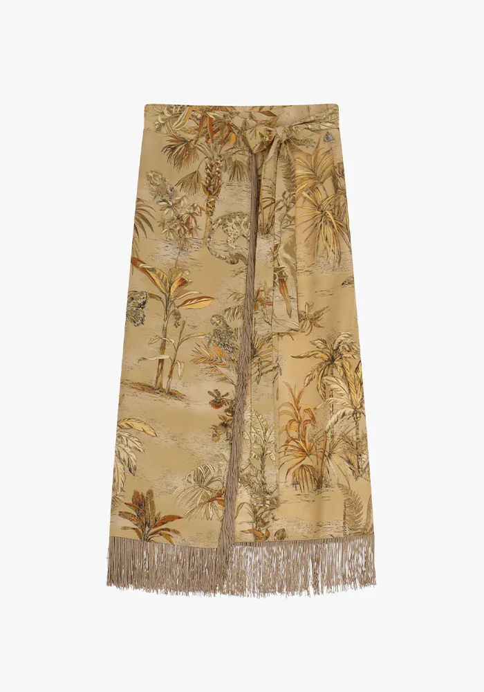 Jupe midi avec un motif palmier ton sur ton avec des franges fines sur le bas.