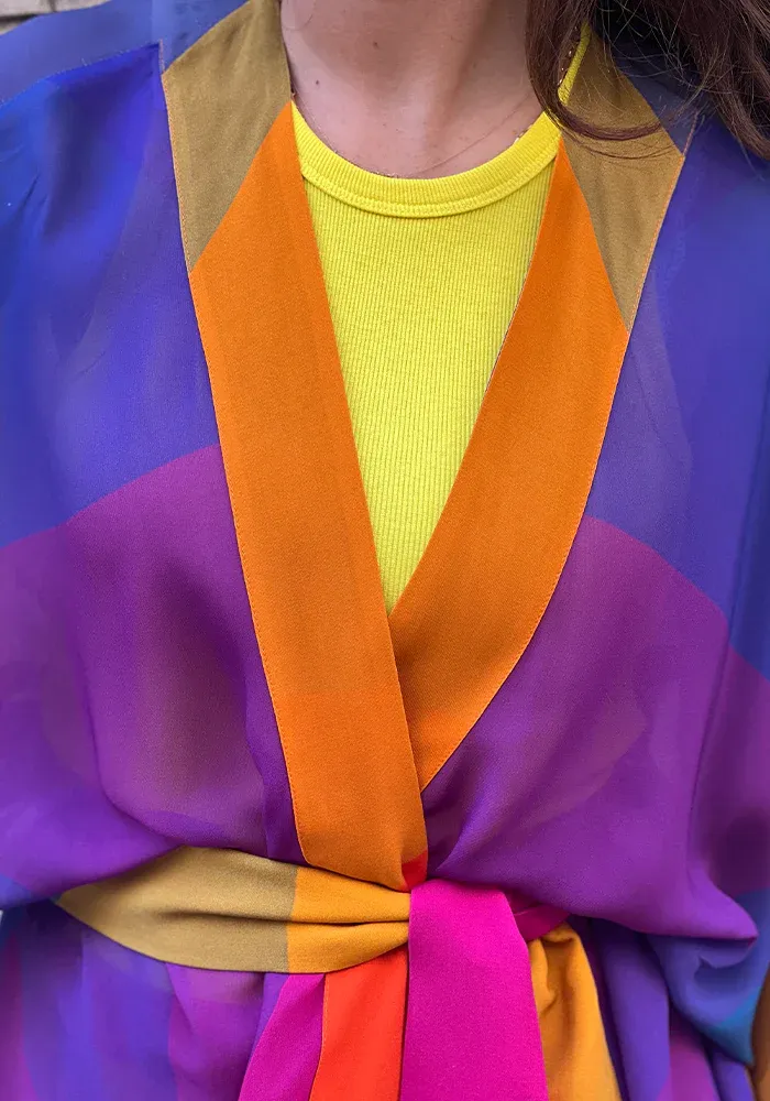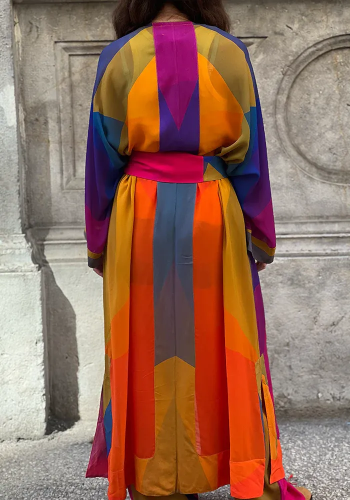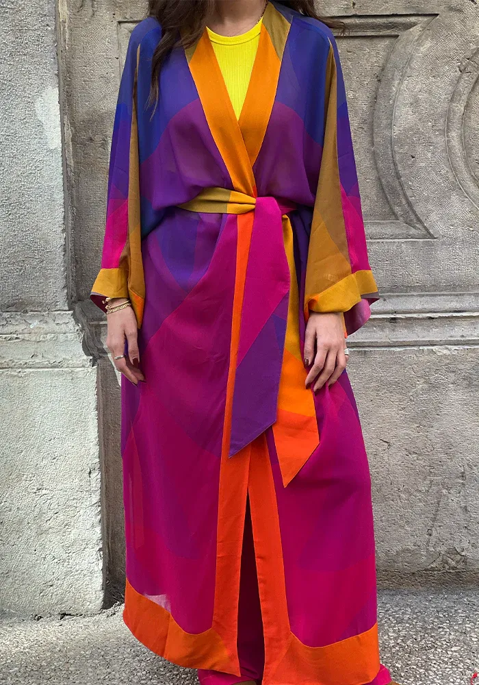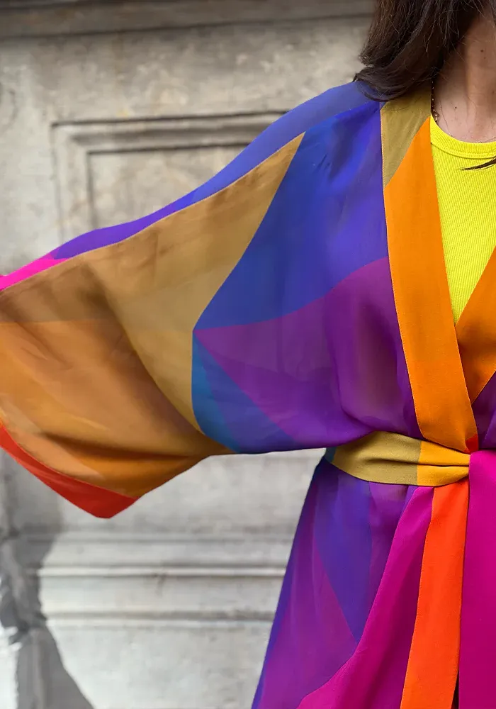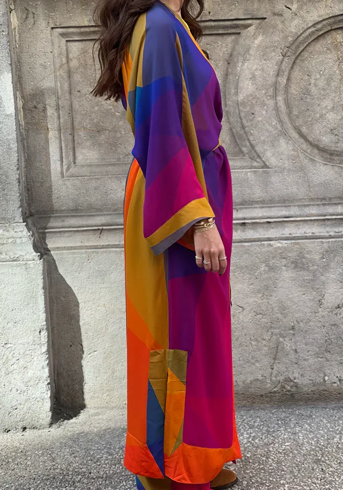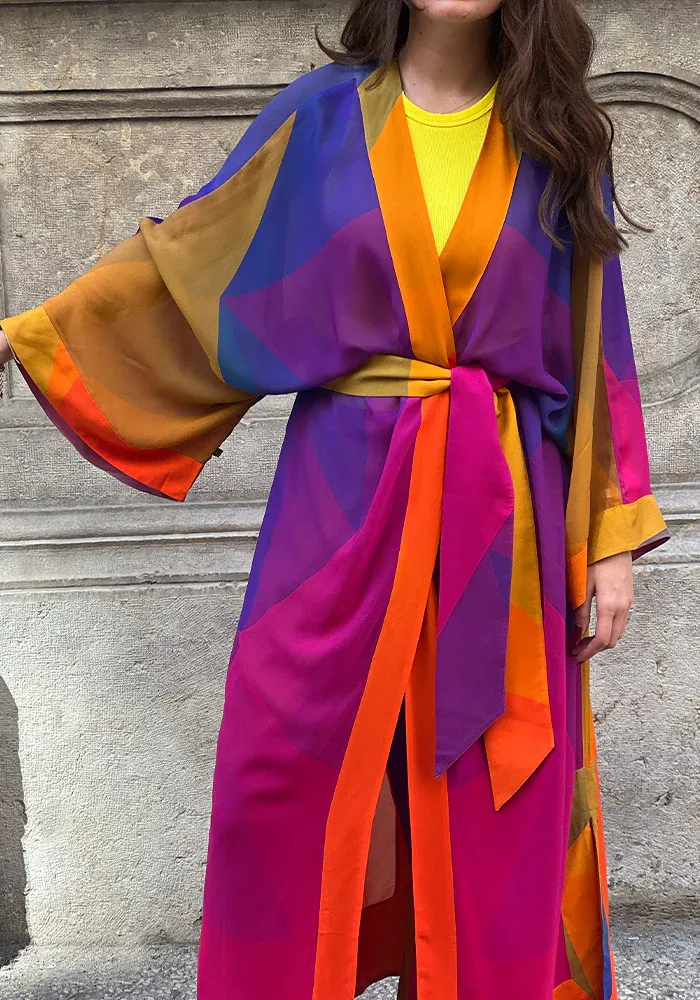 Kimono L Laoun long avec des manches longues et évasées, une ceinture à nouer dans un motif multicolore.