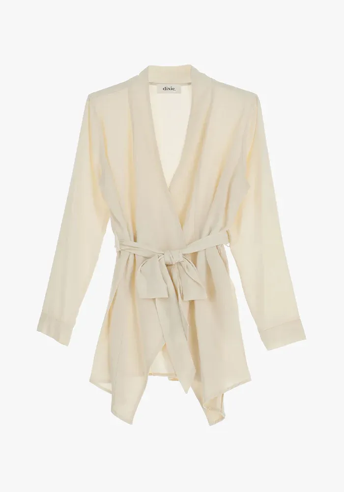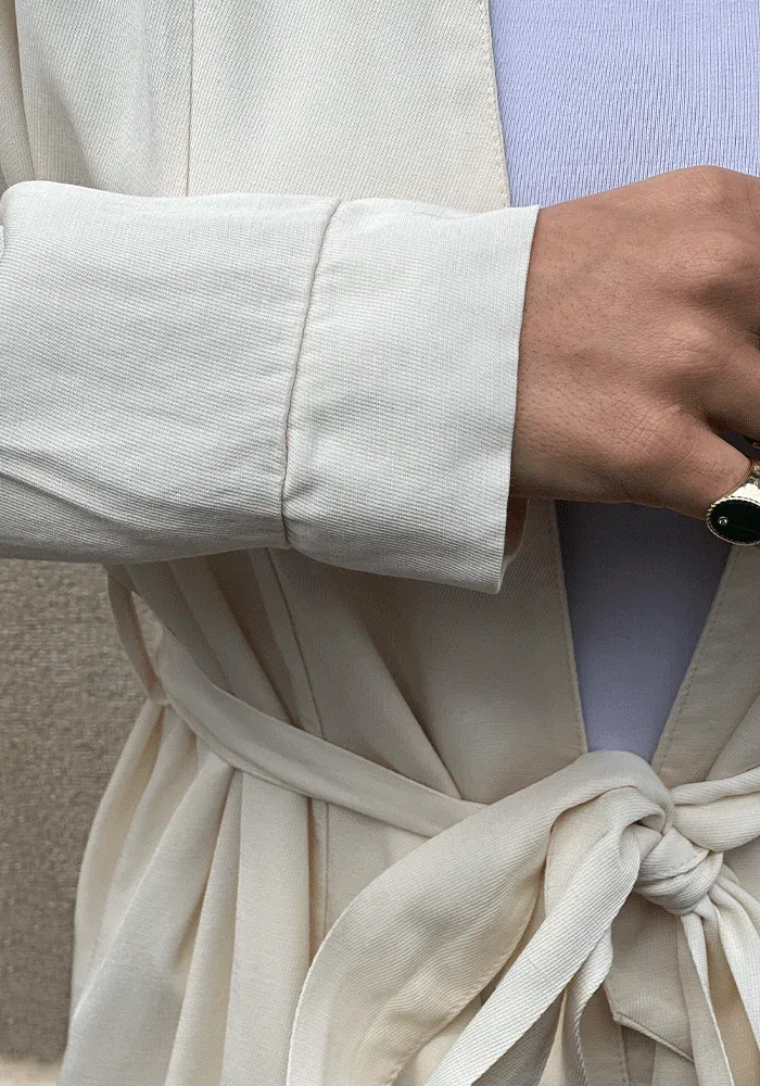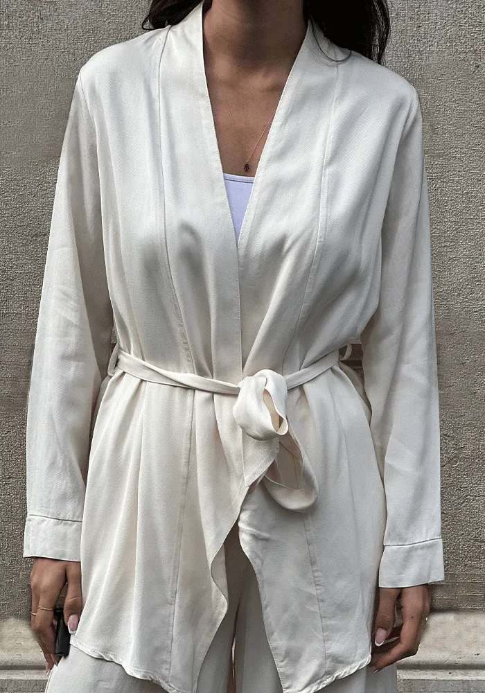 Kimono Yvan mi-long beige à ceinture.