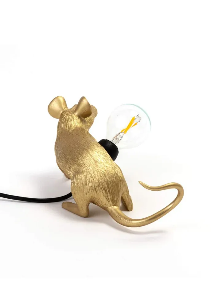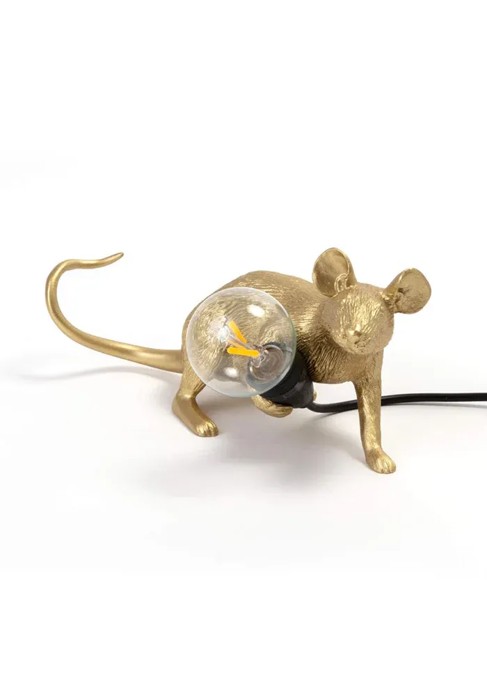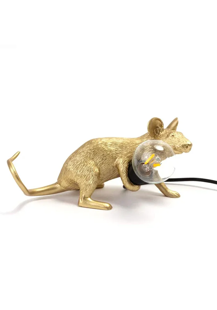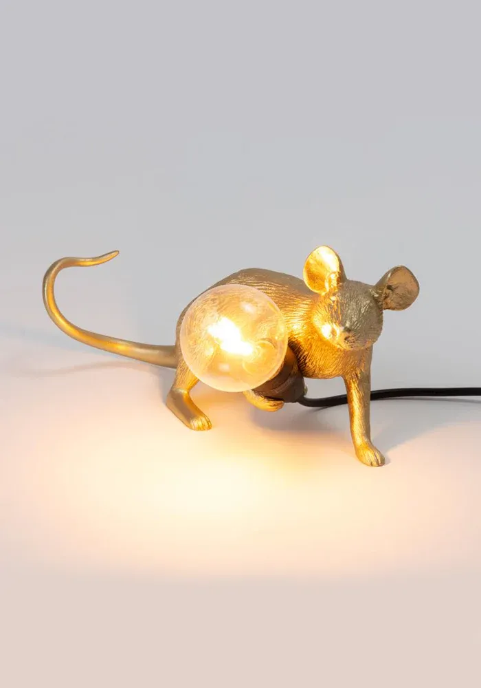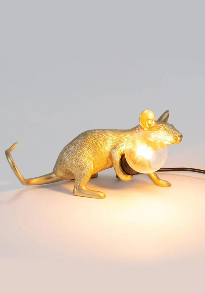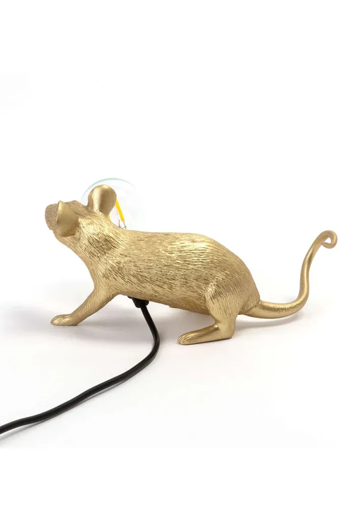 Lampe Mouse Gold en forme de souris dorée avec une petite ampoule LED.