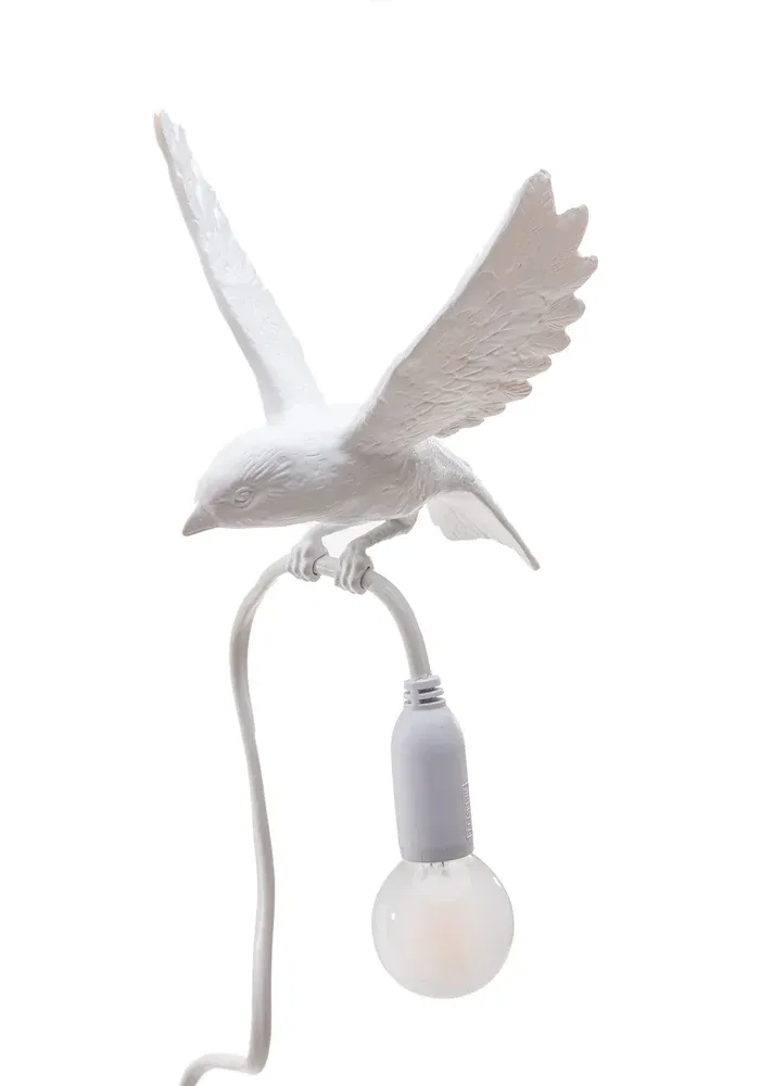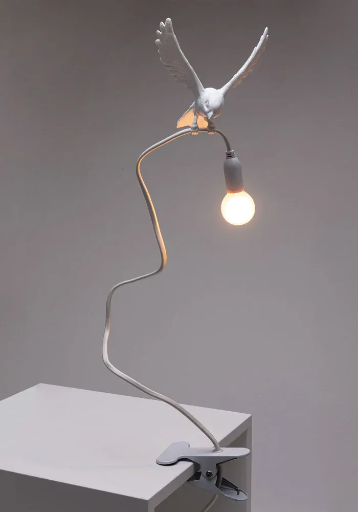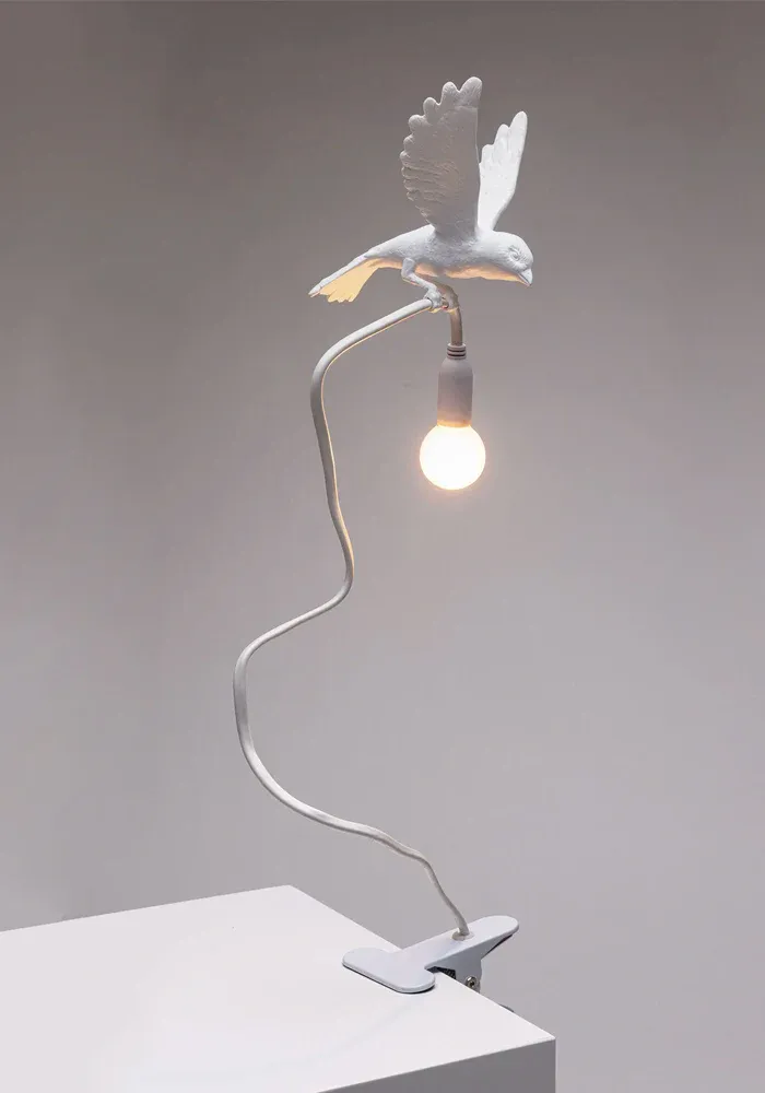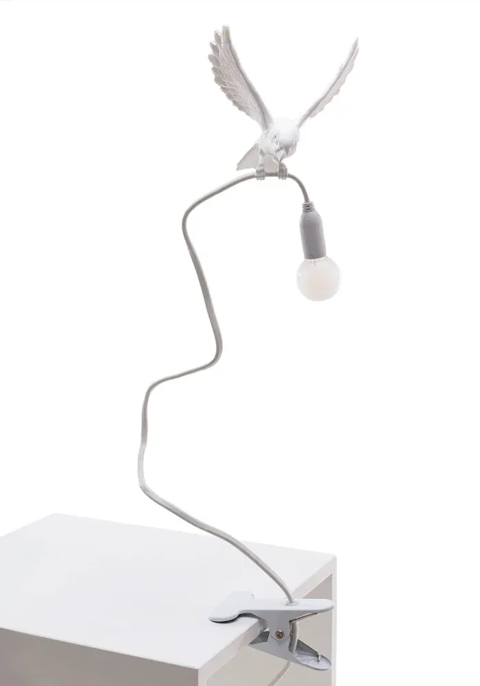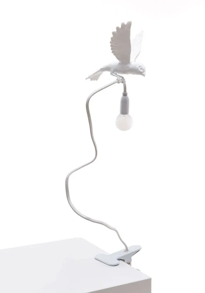 Lampe à clip Sparrow avec un oiseau en résine blanche.