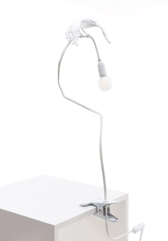 Lampe à clip Sparrow avec un oiseau en résine blanche.
