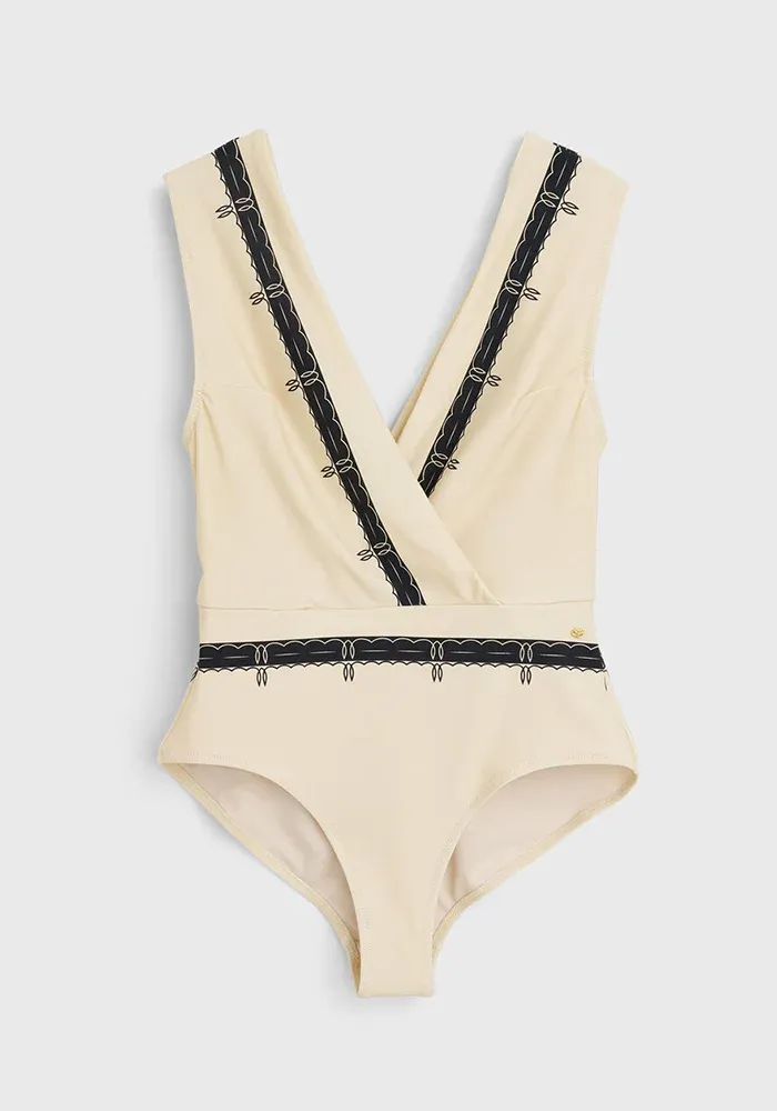 Maillot de bain Lemooria une pièce de couleur beige, avec motif sur les bretelles et à la taille.