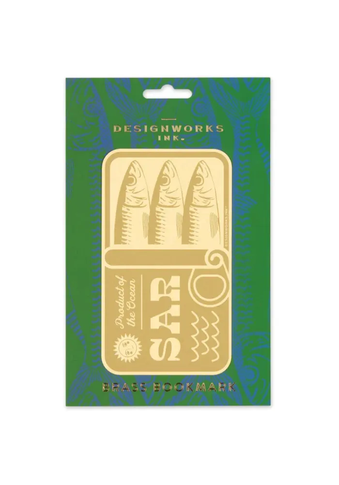 Marque page en laiton doré représentant une boite de sardine doré sur un fond vert.