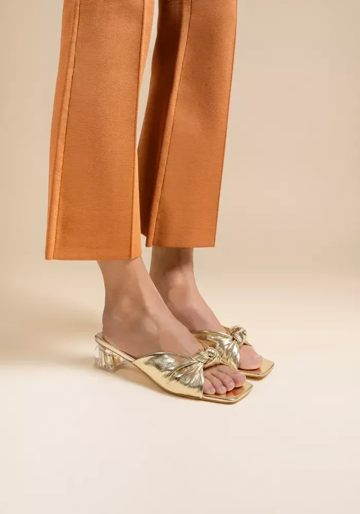 Mules Boboli avec un talon carré transparent, une bride en cuir souple nouée et un bout carré.