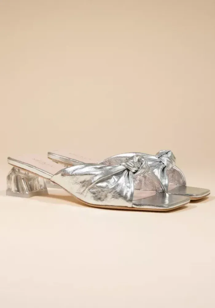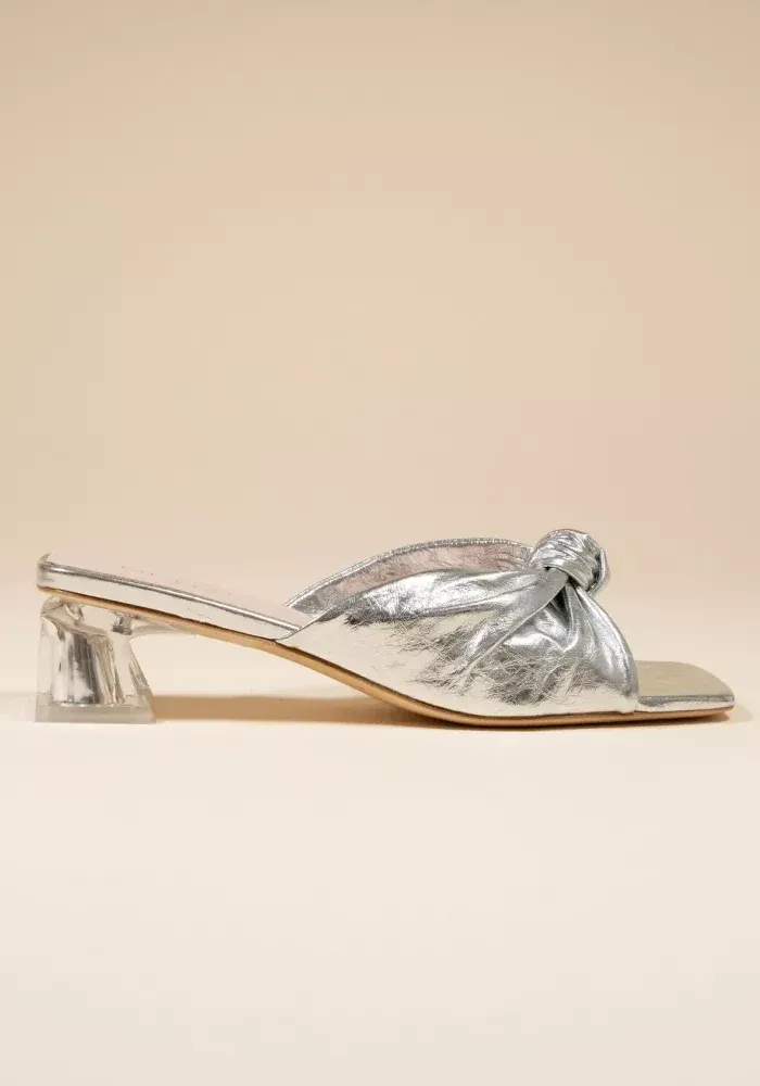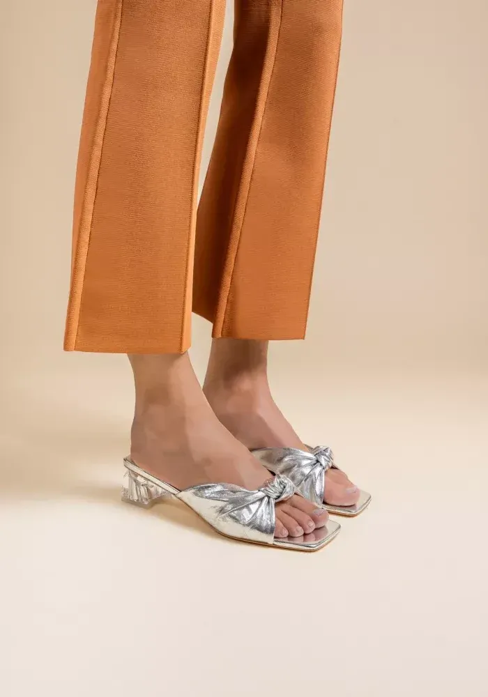 Mules Boboli avec un talon carré transparent, une bride en cuir souple nouée et un bout carré.