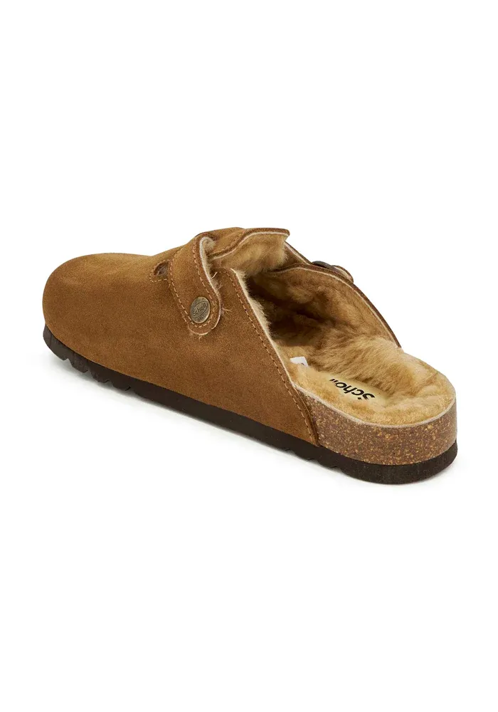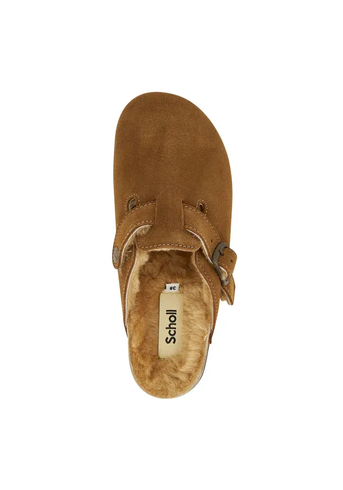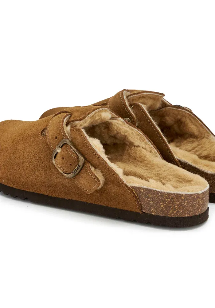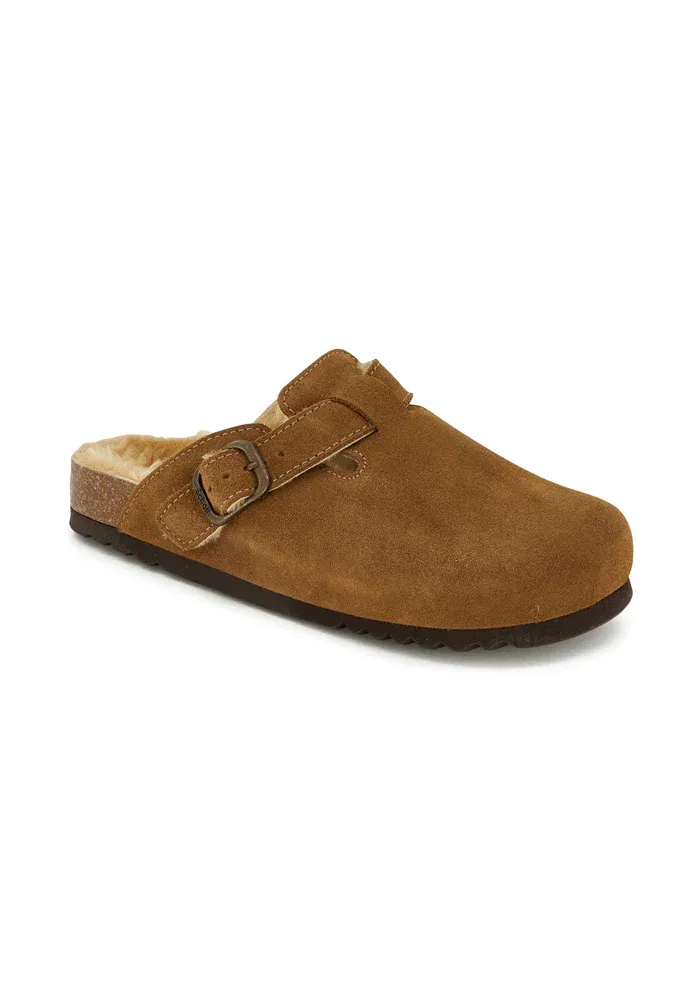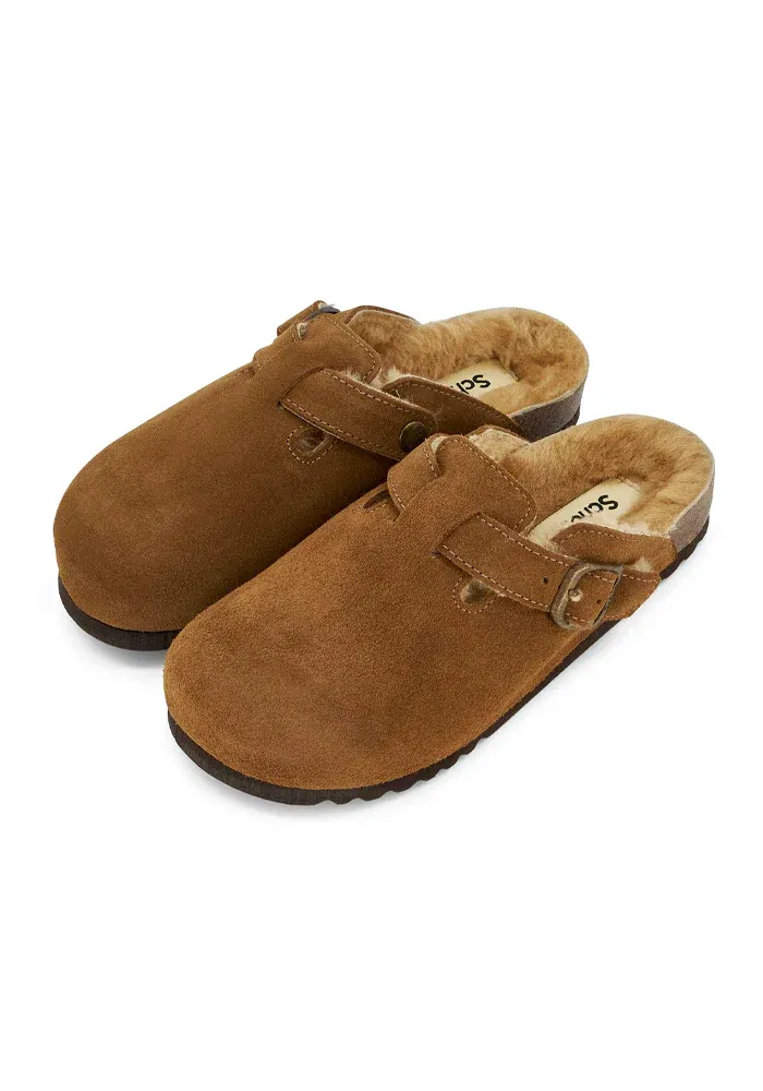 Mules Fae New en suède taupe avec l’intérieur en peau de mouton beige et une bride.