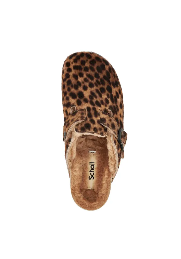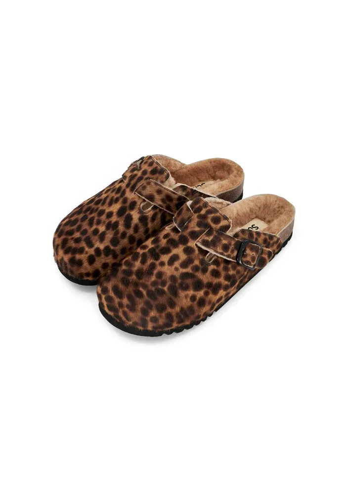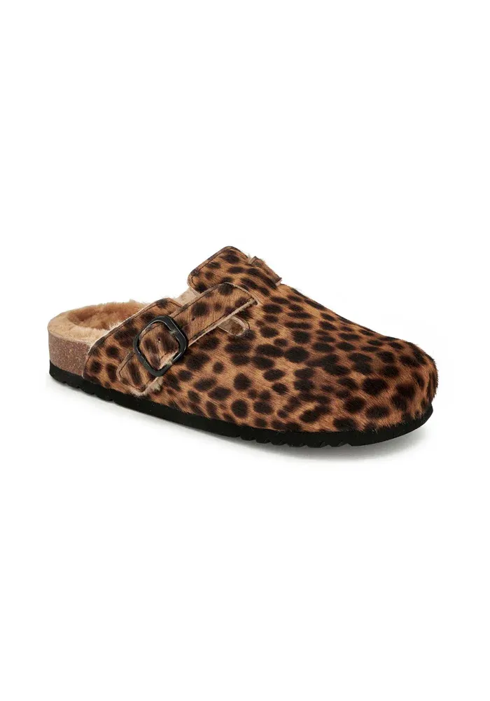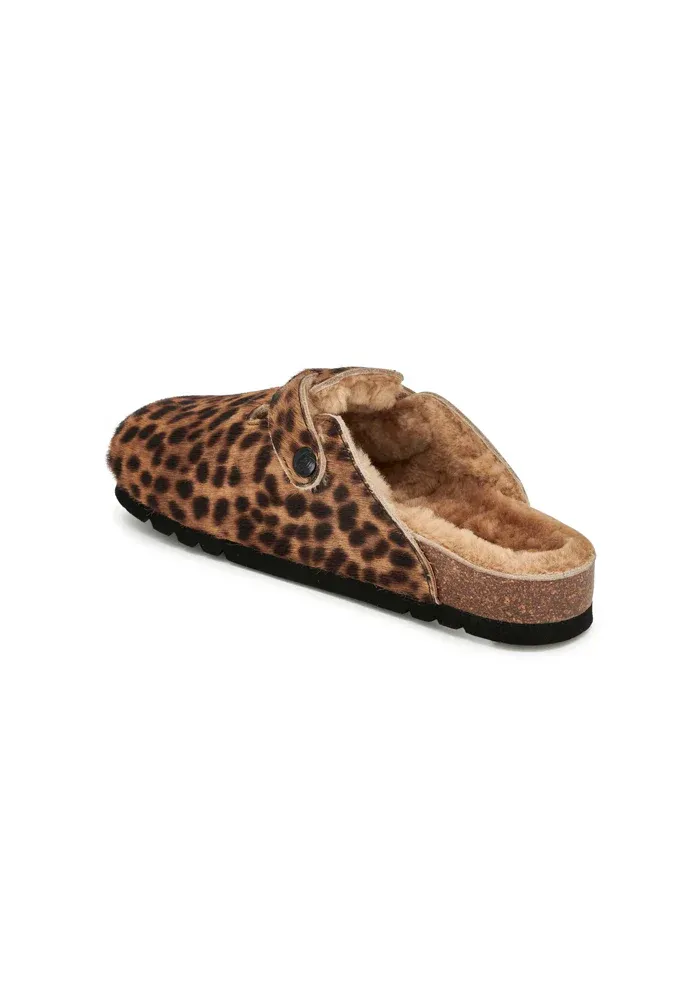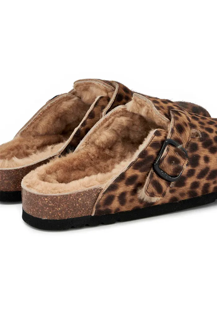 Mules en cuir imprimé avec de la fausse fourrure à l’intérieur.
