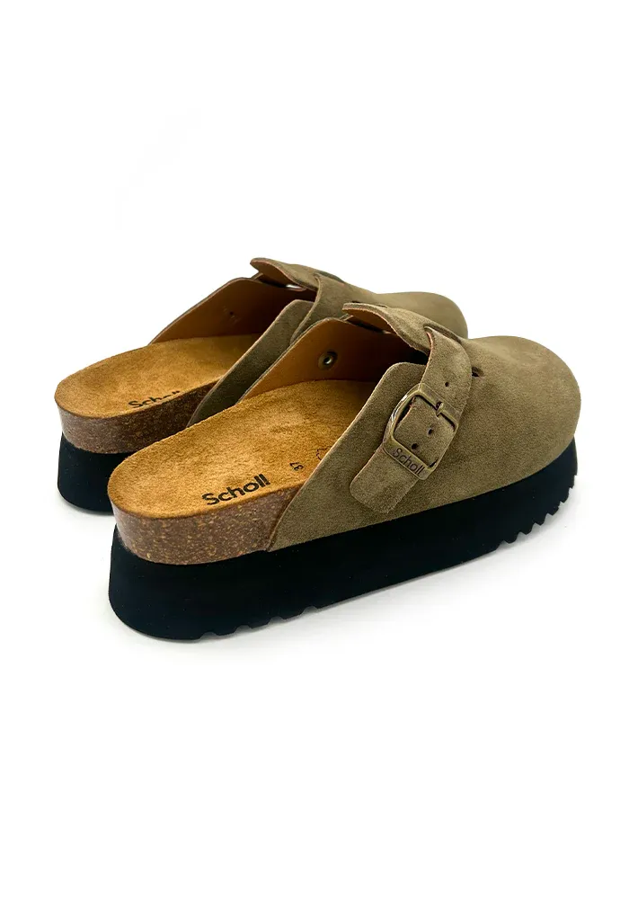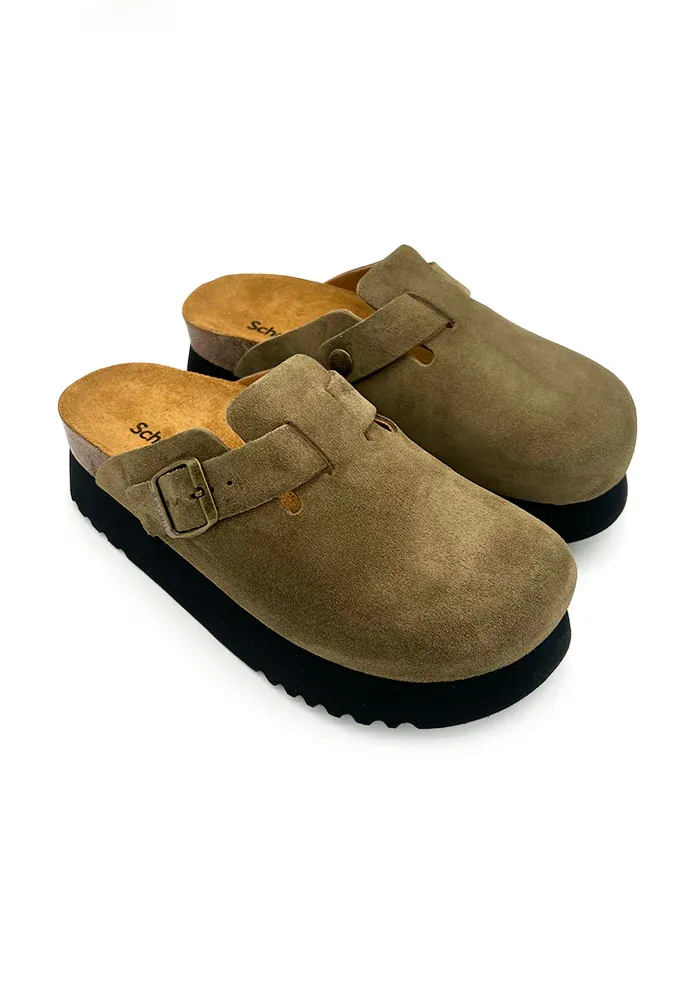 Mules Justine kaki en suède avec une bride et des semelles épaisses noires.