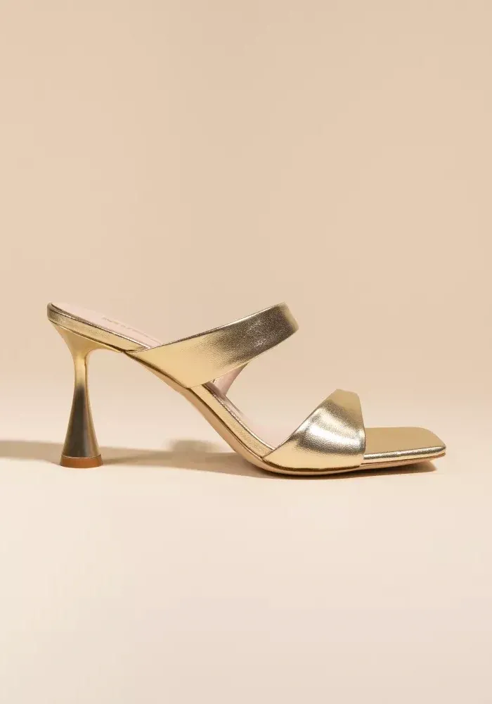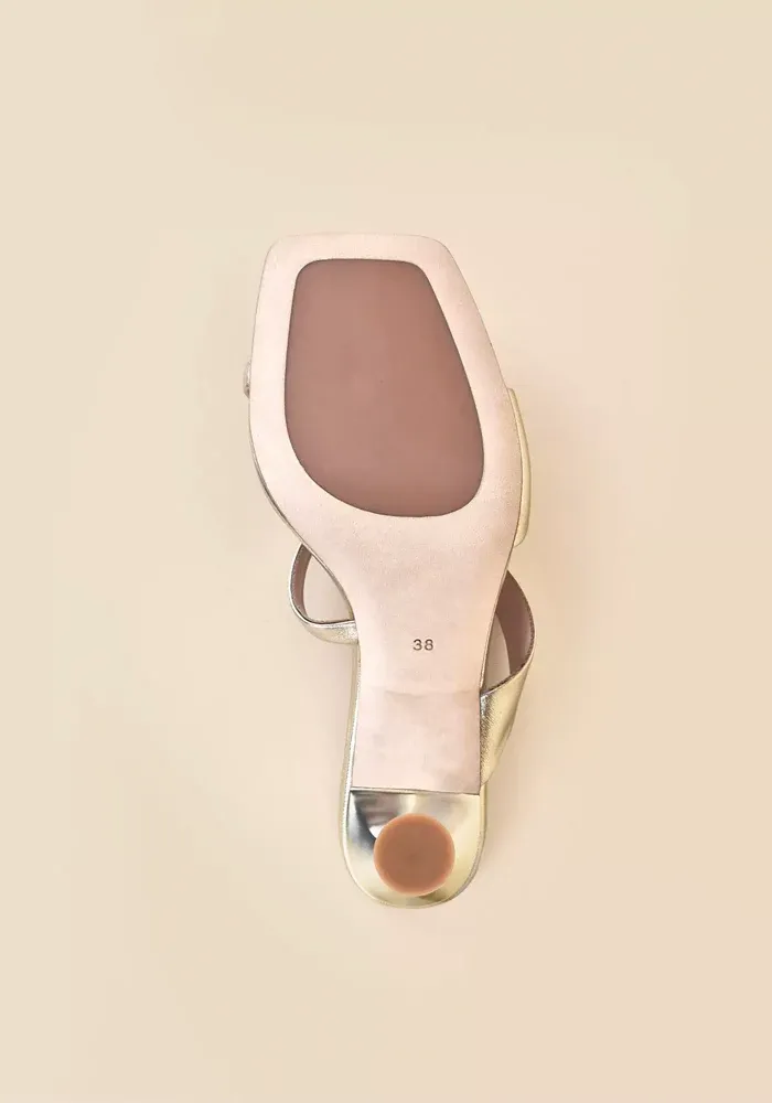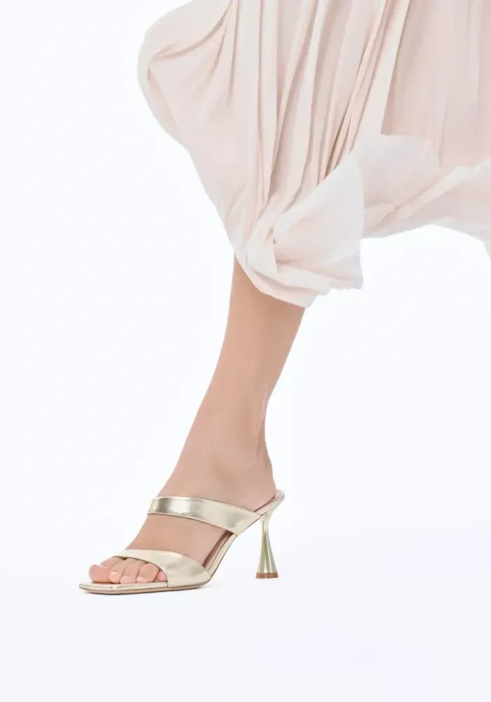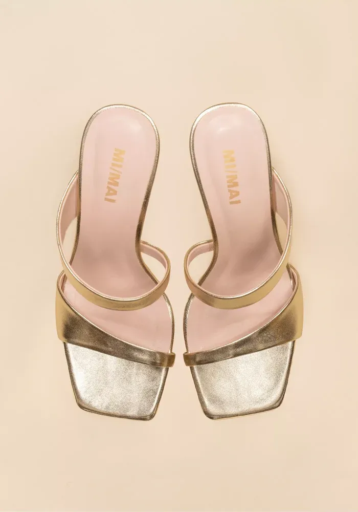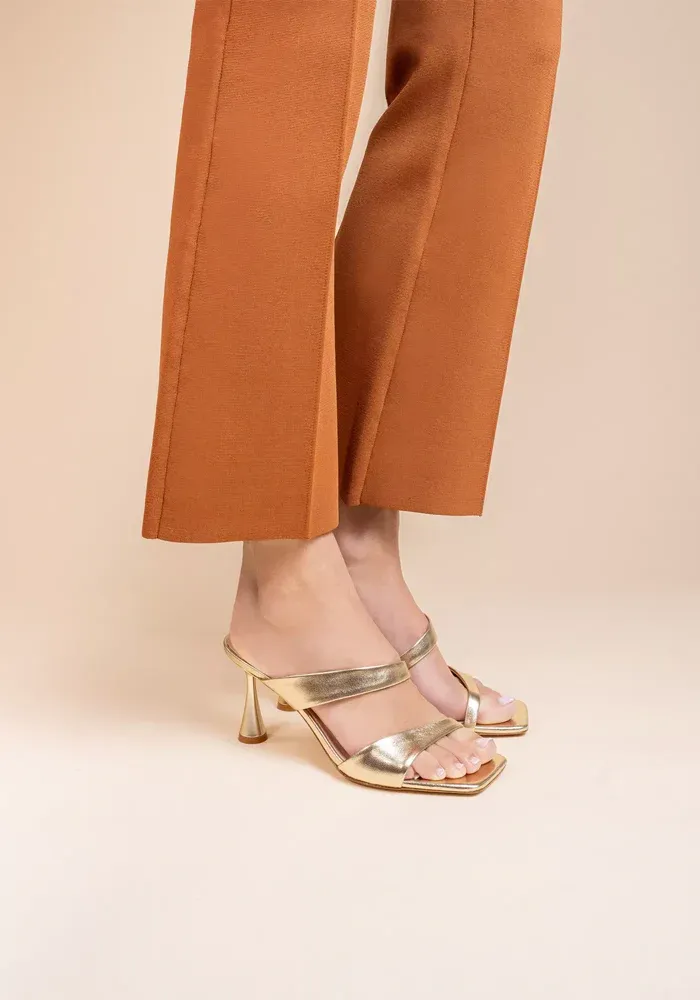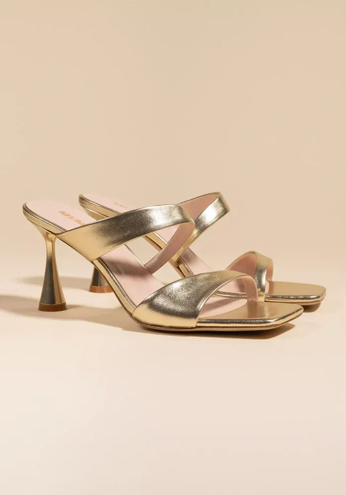 Mules Tara à talons avec deux brides asymétriques en cuir de veau doré.