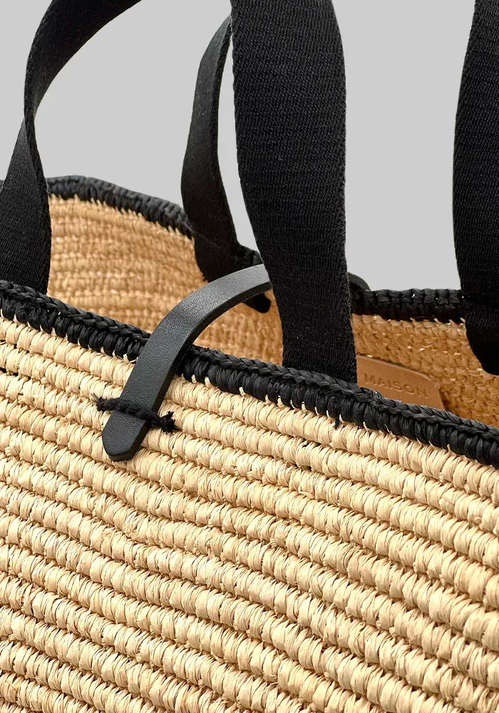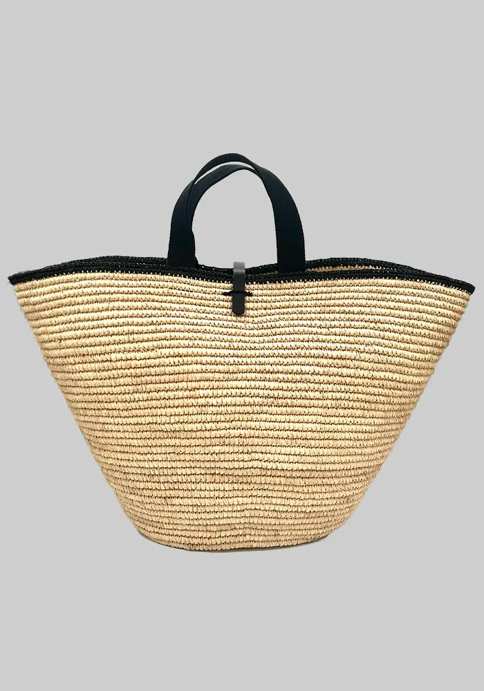 Sac Carla XL panier en raphia naturel avec une bande noir sur le haut, deux poignées en coton noir et une lanière noir pour fermer.