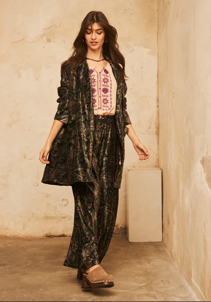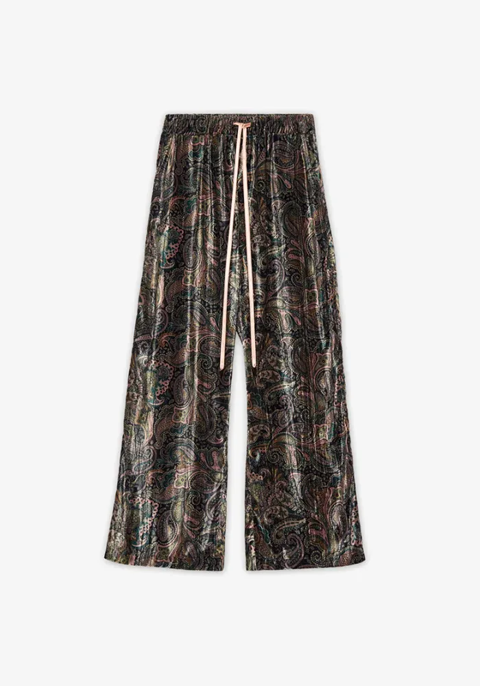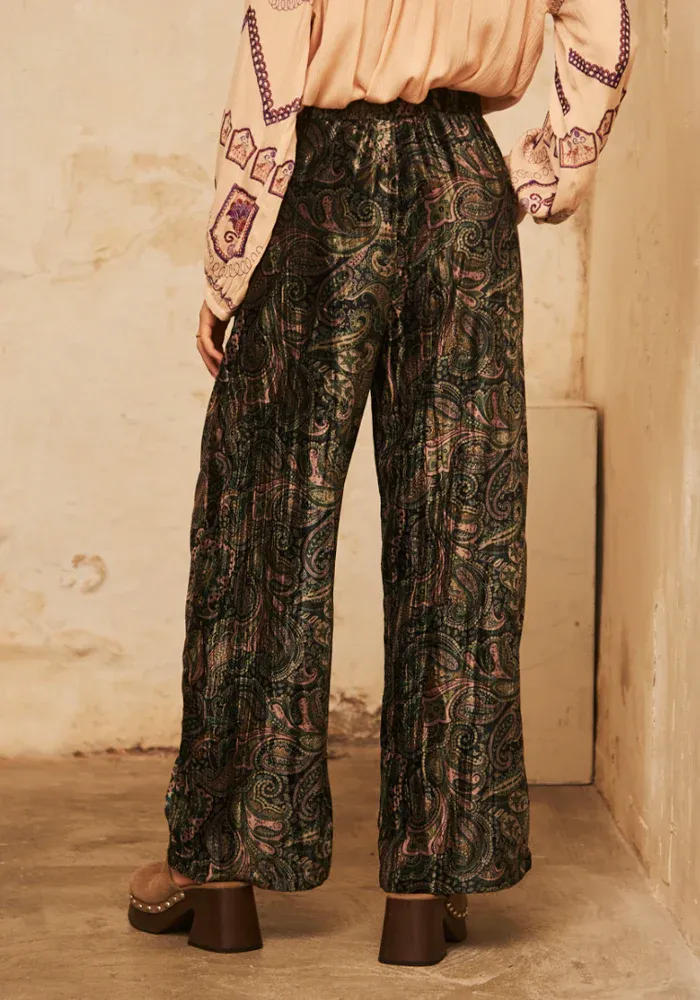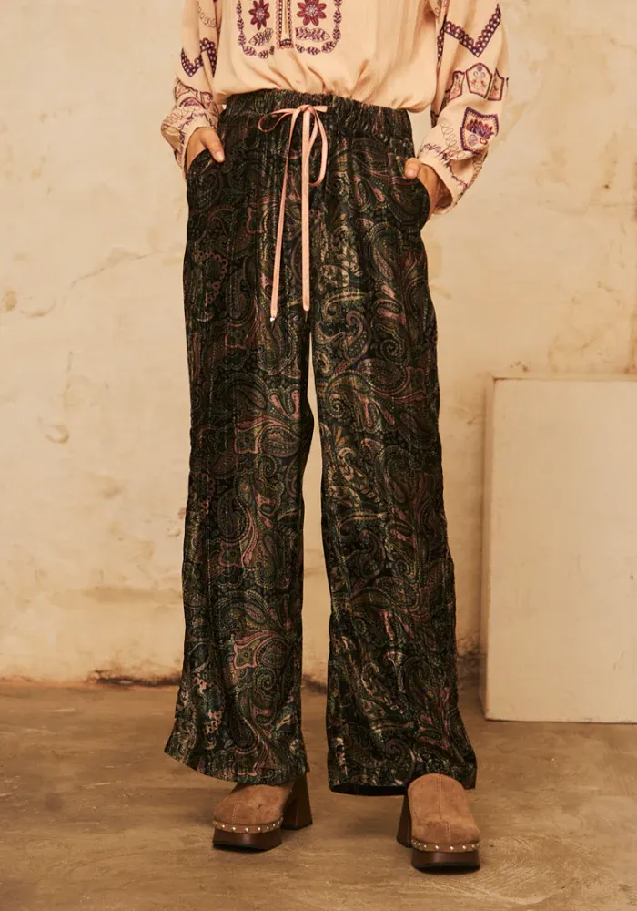 Pantalon Atabey droit en velours avec une taille élastique et des motifs cachemire dans les tons de vert.