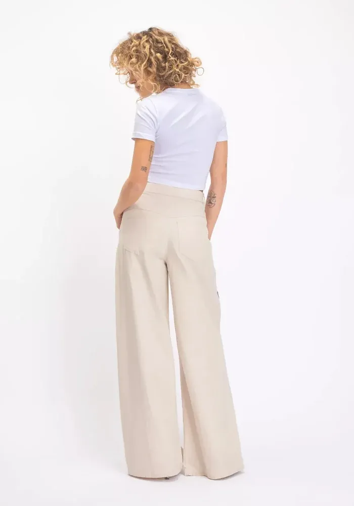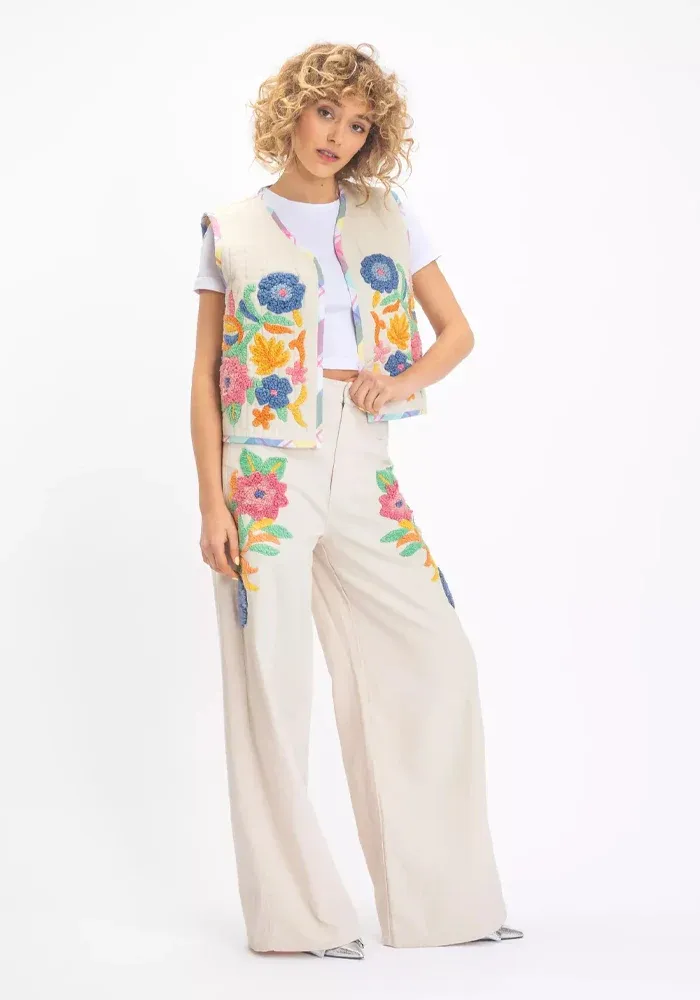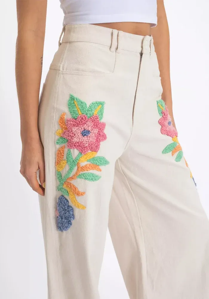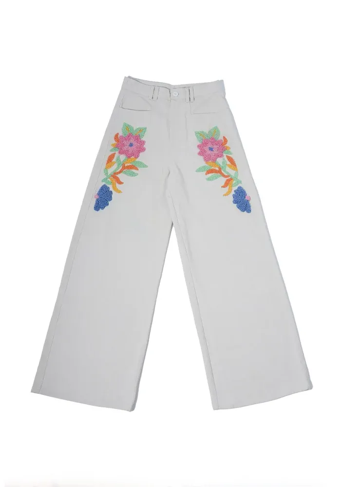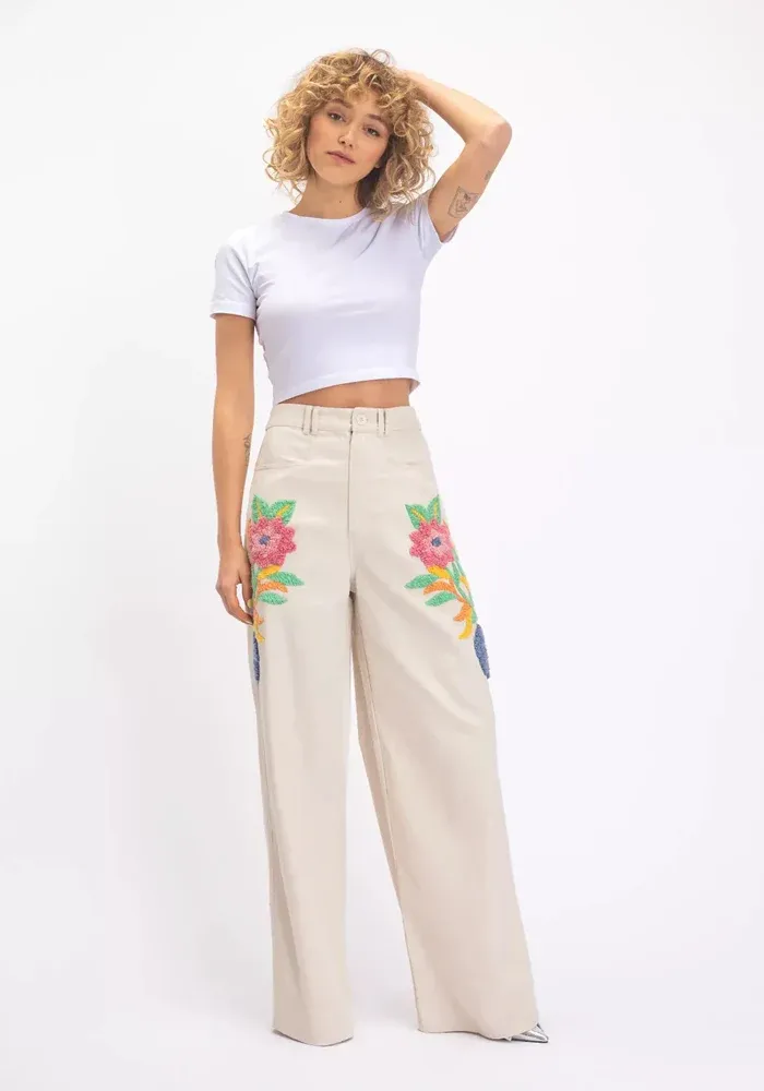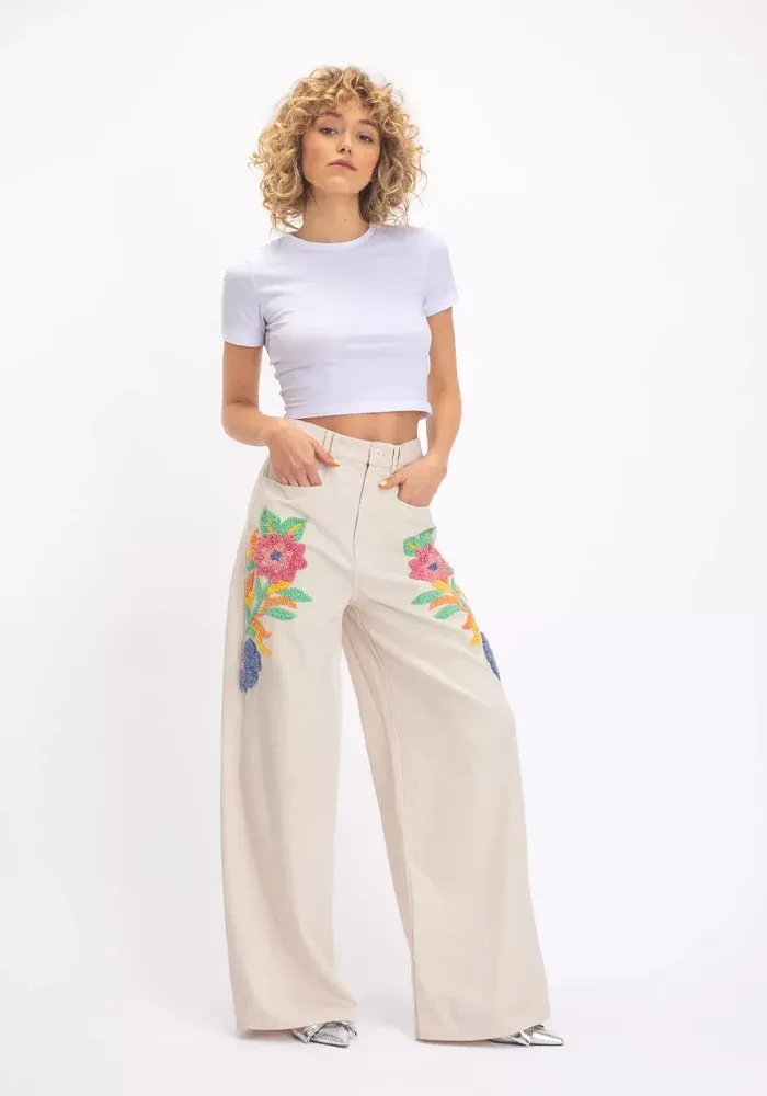 Pantalon Brama évasé en coton beige avec des broderies de fleurs de chaque côté.