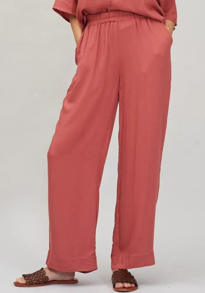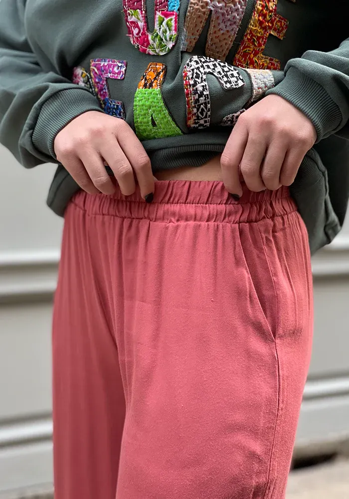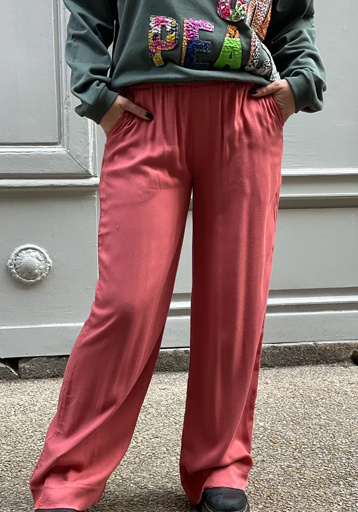 Pantalon Camélia droit et fluide avec une taille élastique et des poches sur le devant, couleur baie rose.